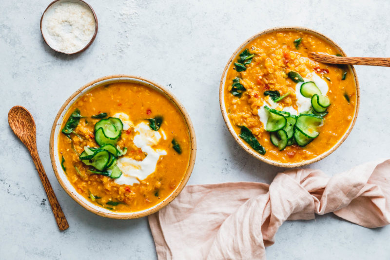 Handarbeit? Maximal 15 Minuten. Und das auch nur, wenn du am Brett und Messer eher so ein bisschen gemächlich unterwegs bist. Die restlichen 20 Minuten kocht sich unsere Curry-Kokos-Linsensuppe eigentlich von alleine.