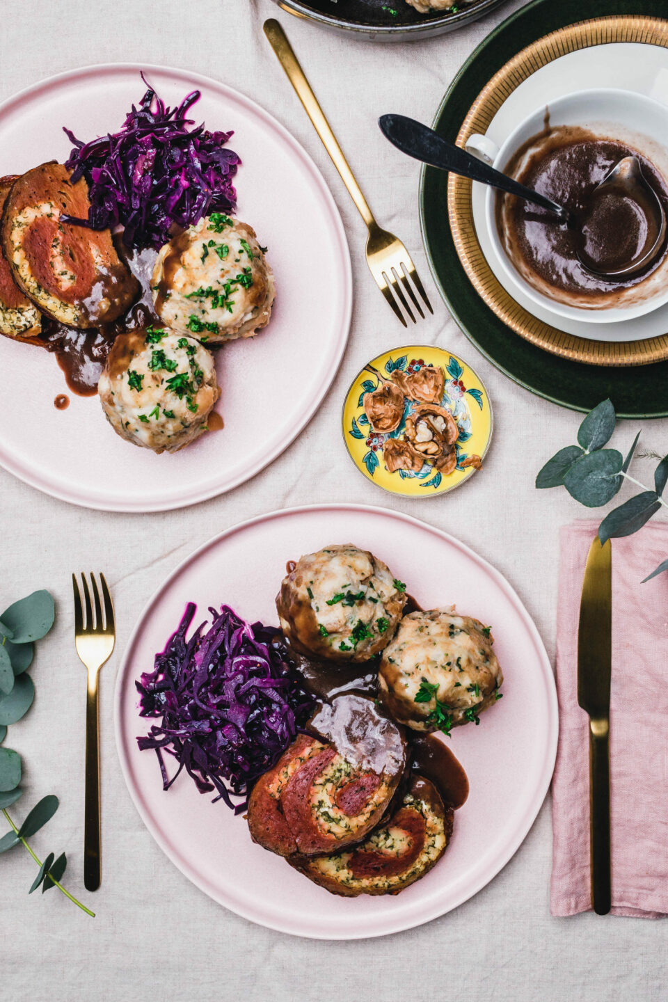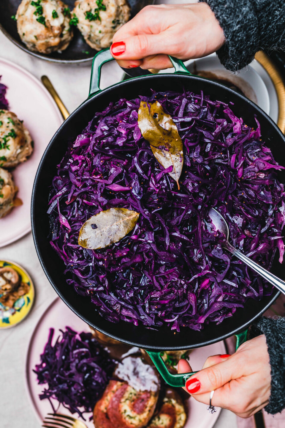 Natürlich macht sich das zarte Kraut auch perfekt in der Runde unseres diesjährigen veganen Weihnachtsmenüs mit deftigen veganen Semmelknödeln, einem festlichem Seitan-Rollbraten und natürlicher unserer besten Bratensauce!