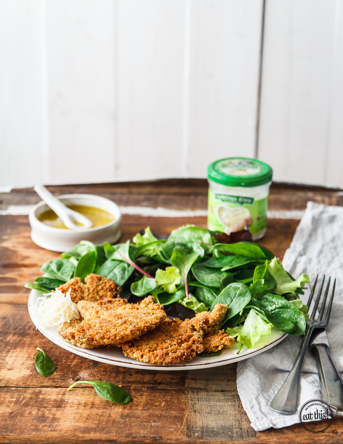 Austernpilzschnitzel auf Salat anrichten und mit Vinaigrette beträufeln.