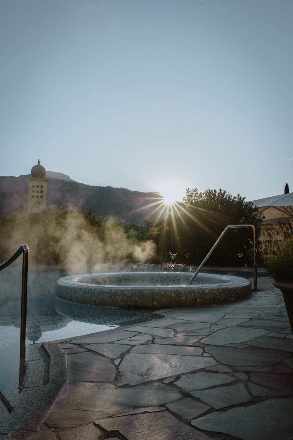 Zurück im Hotel – welches ganz unaufdringlich zwischen Weinreben in die Landschaft eingebettet ist und mit viel Holz ein gemütliches alpines, aber auch einen Hauch mediterranes Flair ausstrahlt – war es einfach schon herrlich, den Sonnenuntergang auf unserer großzügigen Holzterrasse zu genießen. Das geht übrigens besonders gut barfuß, im Bademantel, nach einer entspannenden Schwimmrunde im schönen Spa-Bereich.
