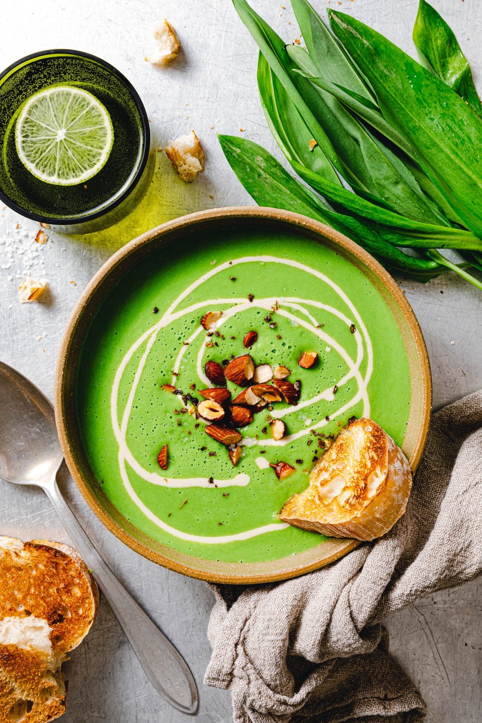 So kochst du unsere Bärlauch-Erbsensuppe mit Tahin und Rauchmandeln
