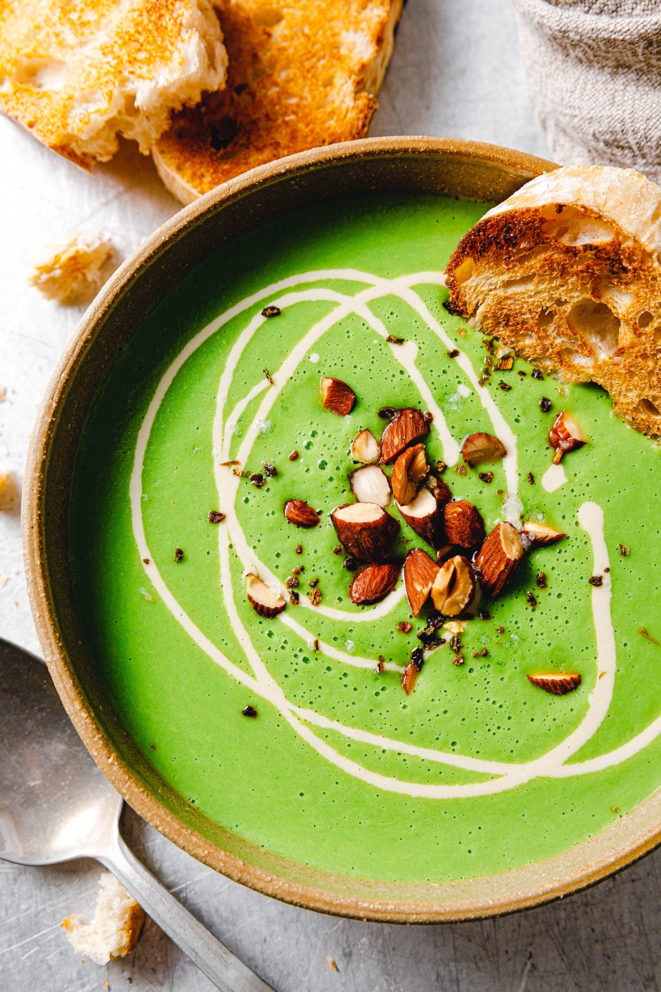 Bärlauch-Erbsensuppe mit Tahin und Rauchmandeln
