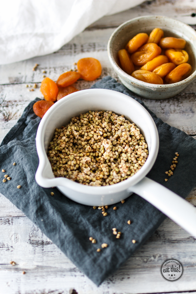 - Buchweizen in einem Sieb unter fließendem Wasser abspülen und in einem Schälchen mit ausreichend warmem Wasser und 1 TL Apfelessig über Nacht einweichen. Aprikosen ebenfalls über Nacht in reichlich Wasser einweichen.