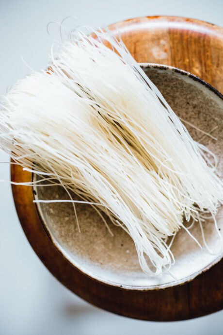 No. 1: Was bei Hartweizenpasta mehr in Richtung Urban Legend geht (auf die wir auch die längste Zeit reingefallen sind), gilt bei Reisnudeln wirklich: Sie brauchen viel Raum und Wasser. Nimm also auf jeden Fall den etwas größeren Topf aus dem Schrank. Profi-Tipp: Etwas Salz und ein Schuss Essig im Kochwasser geben den Reisnudeln richtig viel Geschmack.