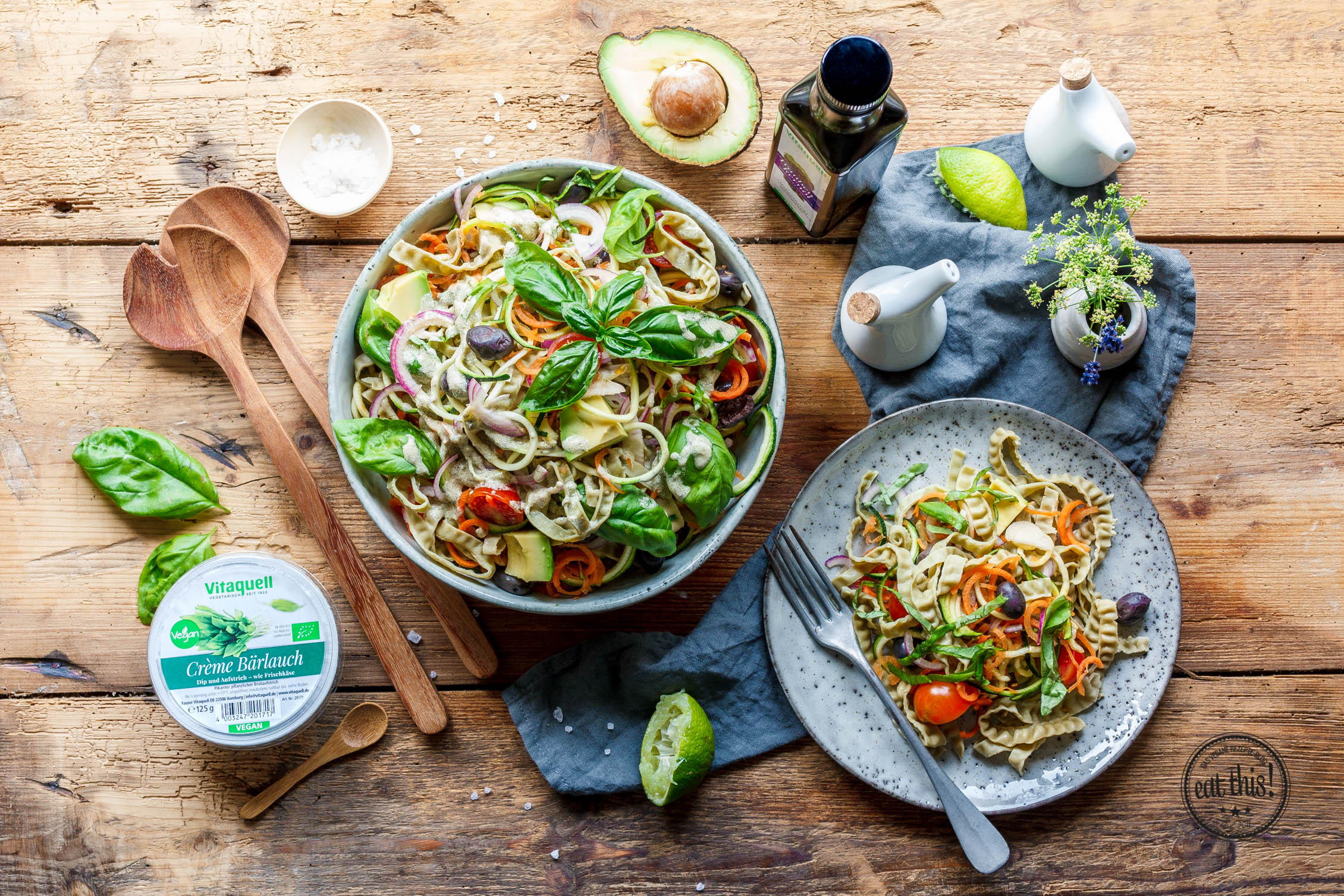 Dass uns kurz zuvor Vitaquell ein Päckchen mit Goodies geschickt und uns herausgefordert hat, etwas Leckeres daraus zu machen, kam uns da total gelegen. Die leichten Tagliatelle aus Sojabohnen passen perfekt in den frischen Salat, die Bärlauch-Crème und das Traubenkernöl sorgen für die Extraportion Würze im Dressing.