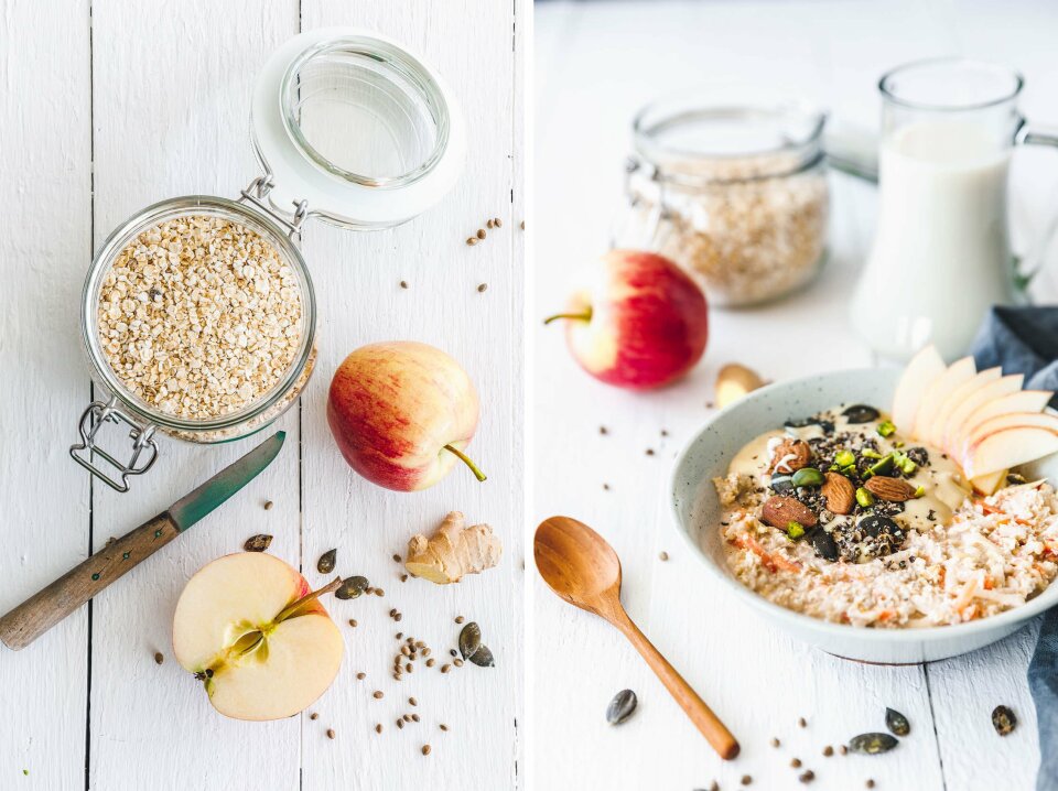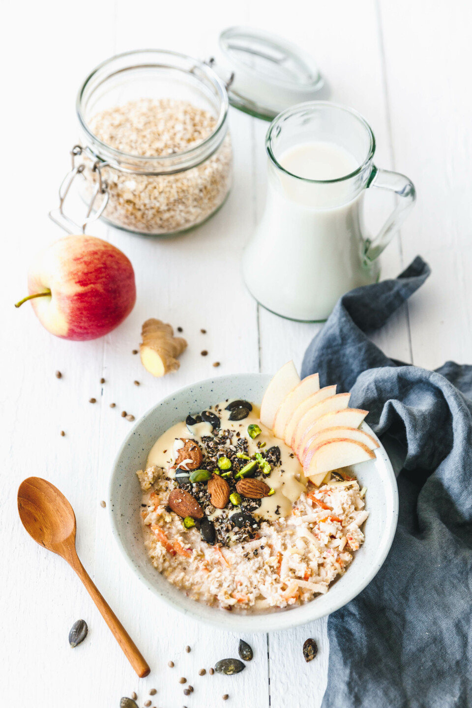 - Apfel, Karotte und Ingwer fein reiben, mit Zitronensaft beträufeln und mit den eingeweichten Haferflocken, Zimt und Kardamom vermengen.