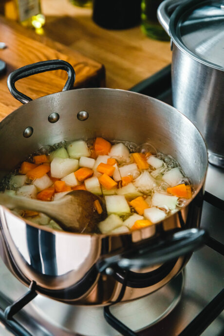 Ungelogen, seitdem wir auf dem Herd mit Kupfer arbeiten dürfen, macht das Kochen noch mal eine ganze Ecke mehr Spaß. Und das ist nicht nur der Ästhetik dieser ultraschnieken Kochwerkzeuge geschuldet. Die Kupfertöpfe haben es im wahrsten Sinne des Wortes in sich: Das Material verteilt die Hitze schnell und gleichmäßig, und zwar nicht nur auf dem Boden, sondern auch an den Wänden. So werden die Zutaten gleichmäßig gekocht, was ideal für empfindliche Gerichte, Saucen wie eben unsere „Einbrenne“ und ganz allgemein für das Einkochen sämtlicher Flüssigkeiten ist.