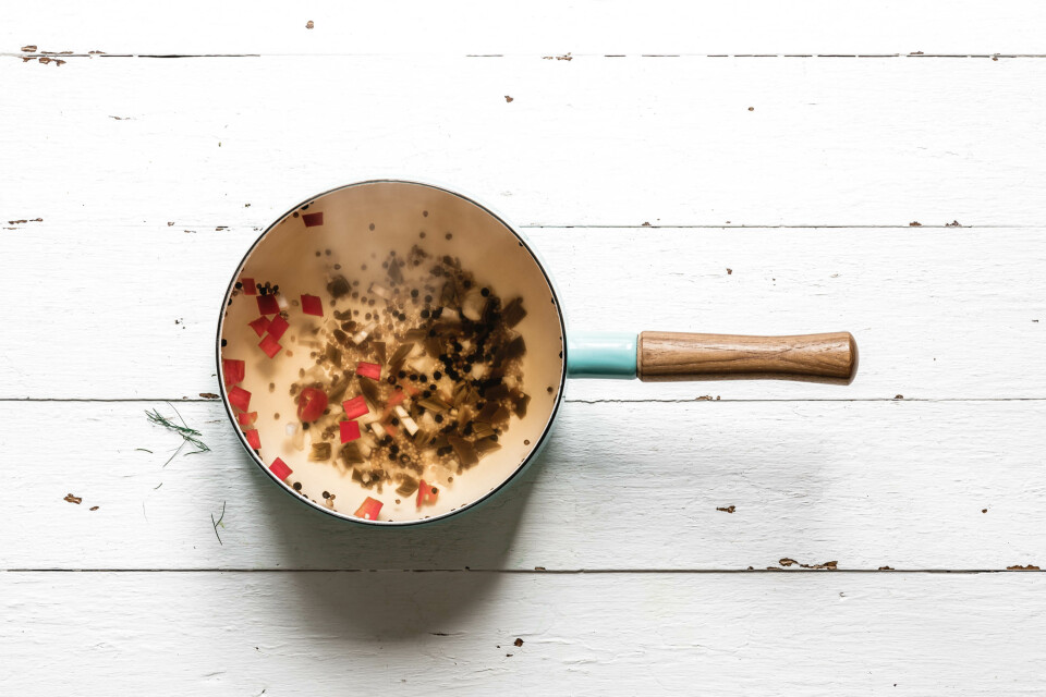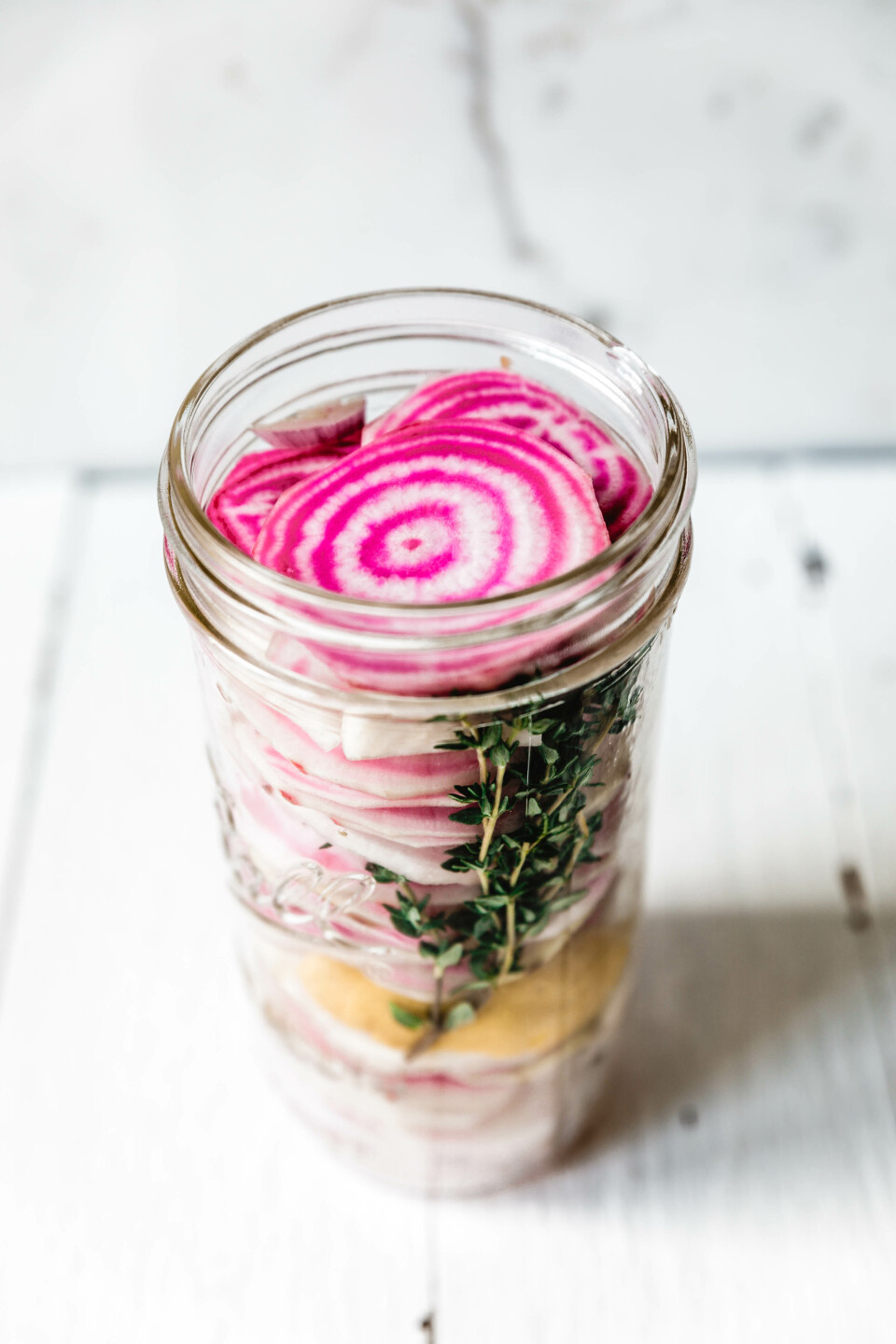 Achtung, jetzt wird’s etwas nerdy. Bei der Methode des Einlegens oder englisch „to pickle“, die wir dir heute vorstellen, wird ein Sud über das Gemüse gegossen, der das Wachstum schädlicher Mikroorganismen wie Schimmelpilzen verhindert. Wir verwenden dazu einen sauren Essigsud, man kann aber auch mit Salzlake, Öl oder Alkohol Lebensmittel haltbar machen.