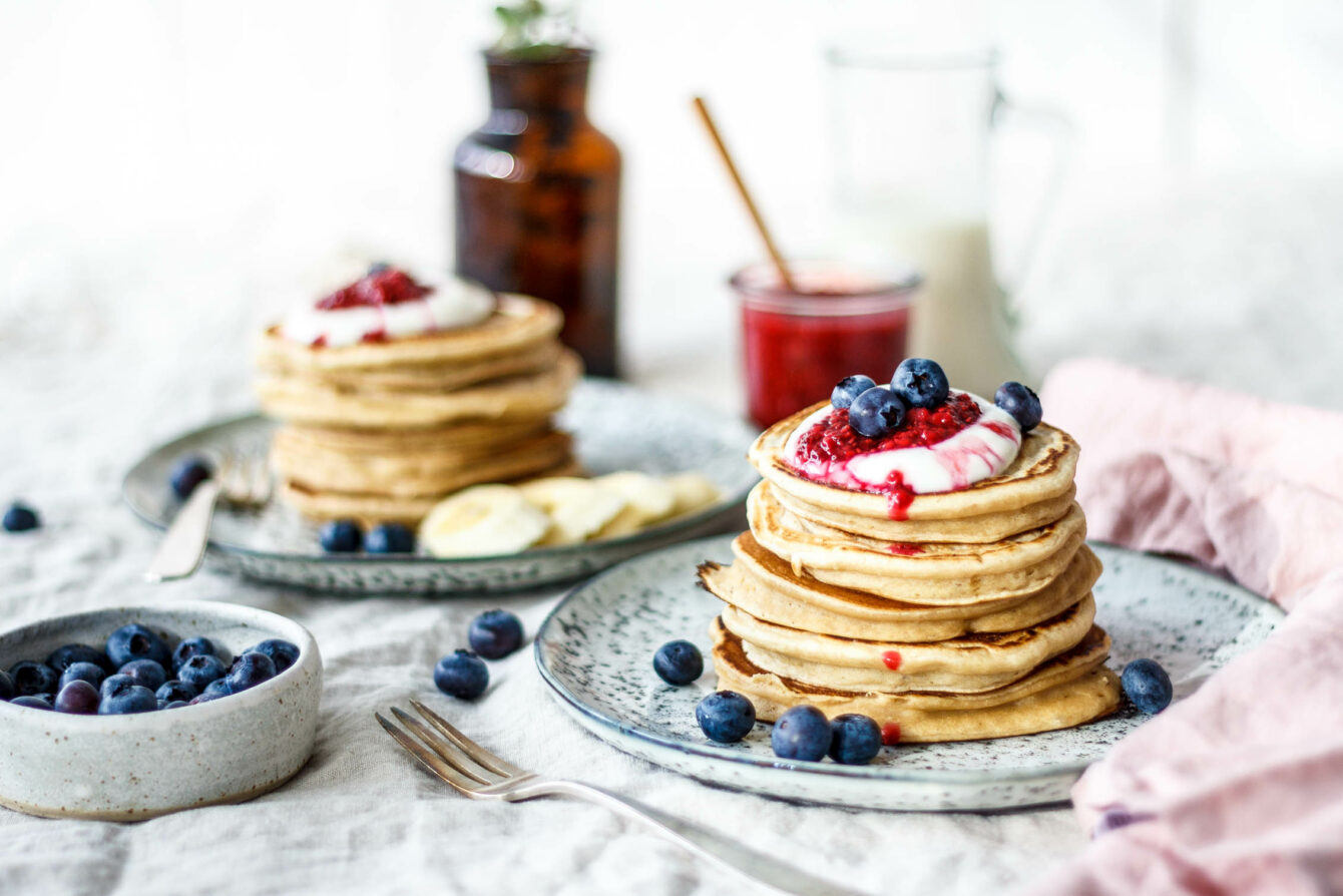 Feines Dinkelmehl, gesundes Kokosöl und lecker-cremiger Mandeldrink – unsere Pancakes darf man ohne schlechtes Gewissen das ganze Jahr über genießen!