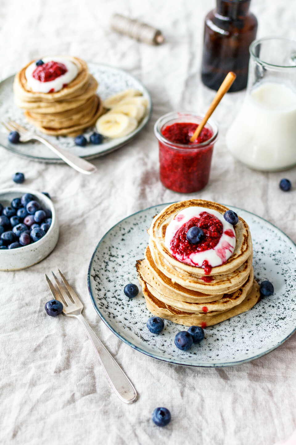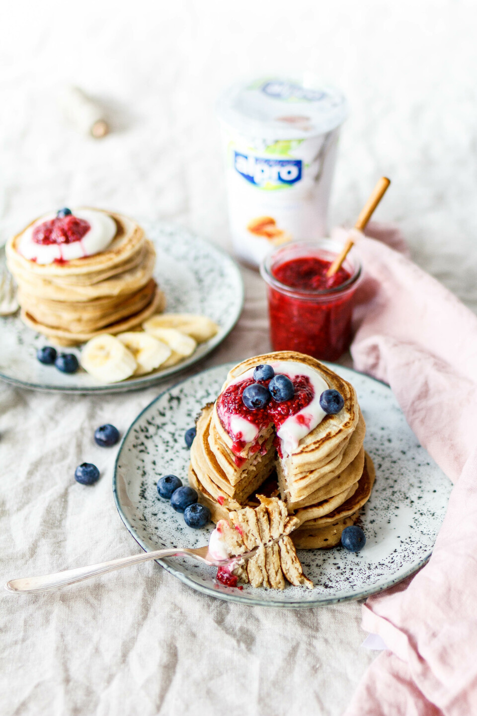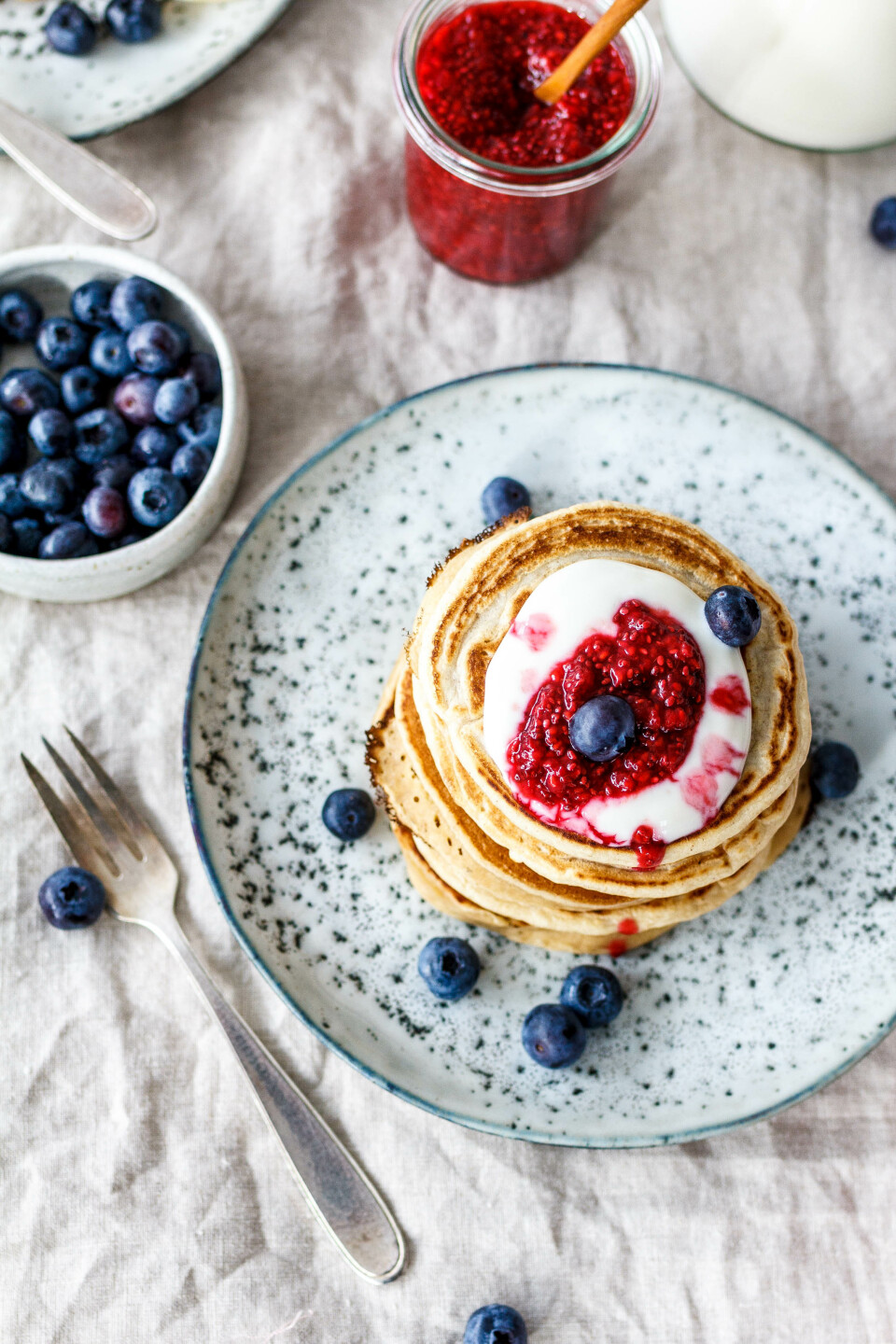 Unsere kleinen Pancakes sind ultra fluffig, kommen ganze ohne Ei-Ersatz, Banane oder ähnlichem aus und schmecken zusammen mit einem Klecks Joghurtalternative mit Mandel, zuckerfreier Himbeer-Chia-Marmelade und frischem Obst unschlagbar lecker.