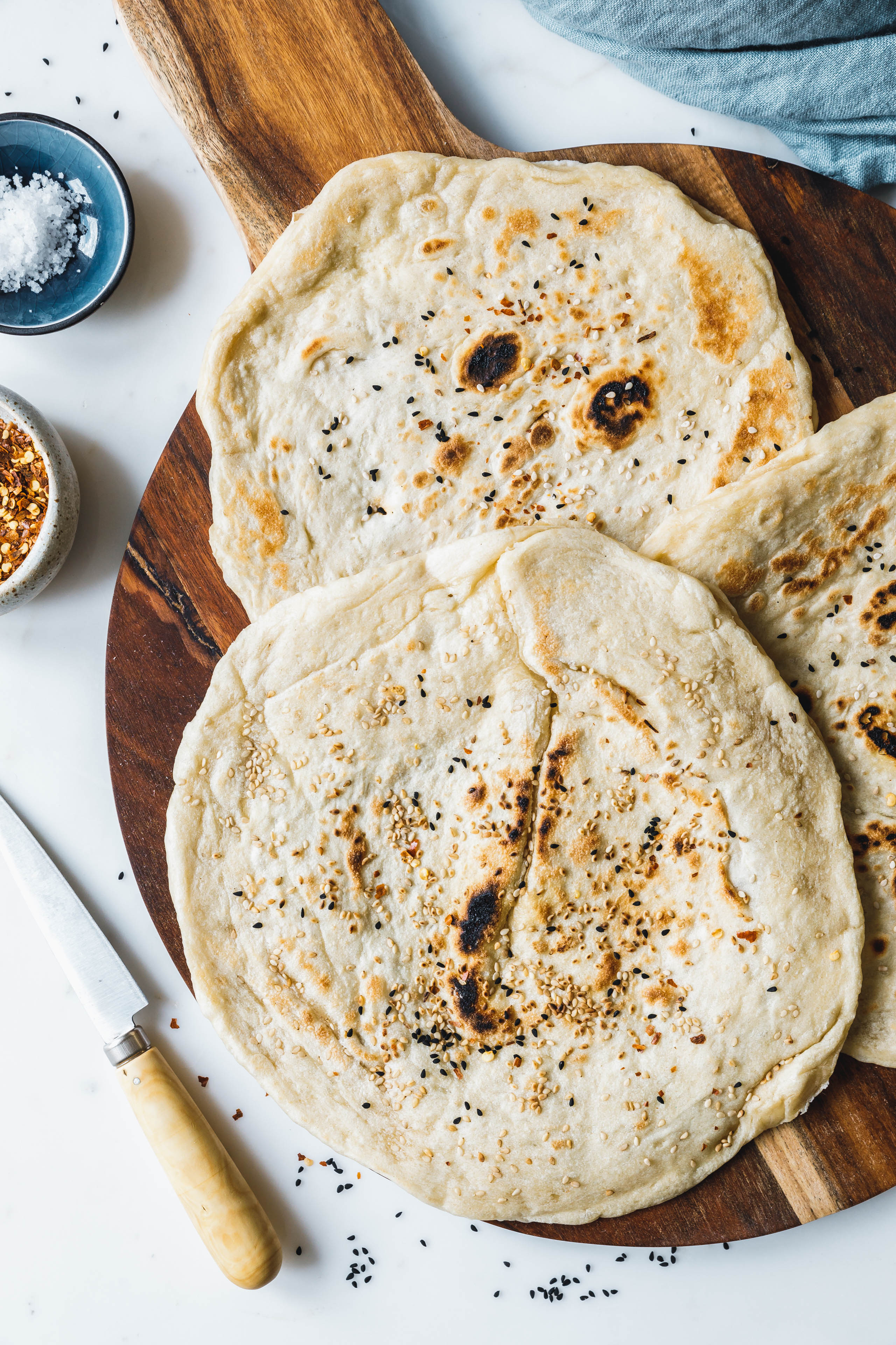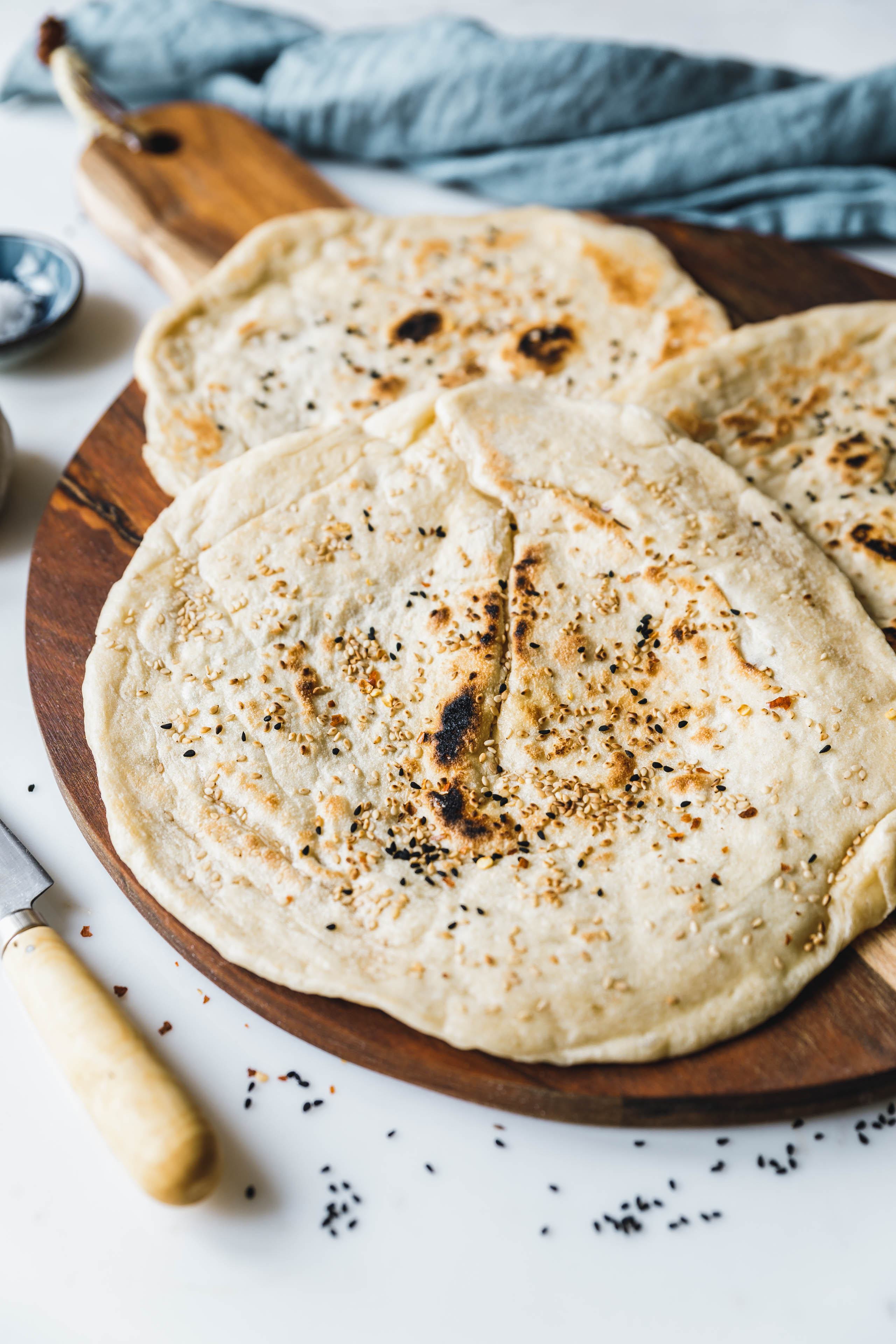Wir backen unsere Flatbreads am liebsten mit Dinkelmehl Type 630, aber auch Weizenmehl Type 550 funktioniert wunderprächtig – tatsächlich wird das Brot sogar noch fluffiger. Du kannst einen Vollkornmehlanteil mit in den Teig mischen, das Brot wird aber nicht ganz so luftig. Wir empfehlen etwa einen Teil Vollkorn auf drei Teile feines Mehl.