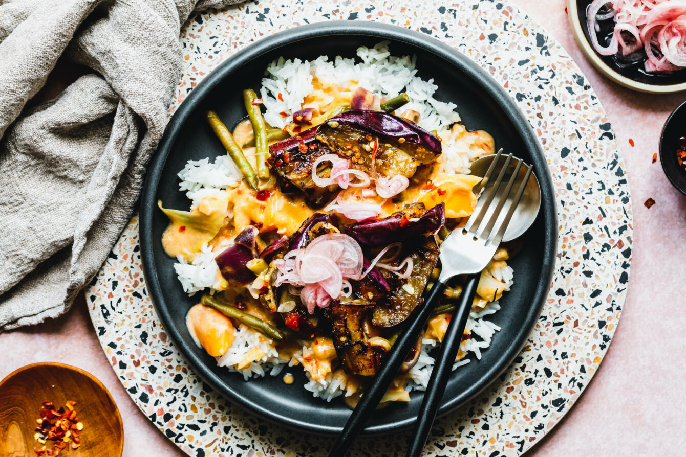 Das mittlerweile auf den Punkt gegarte Curry servieren wir getoppt mit fix in einem gesüßten Essig eingelegten Schalotten und natürlich den saftigen Auberginenspalten am liebsten auf Jasminreis. Aber auch Reisnudeln passen einfach perfekt und natürlich darf ein finaler Hauch Chiliflocken nicht fehlen.