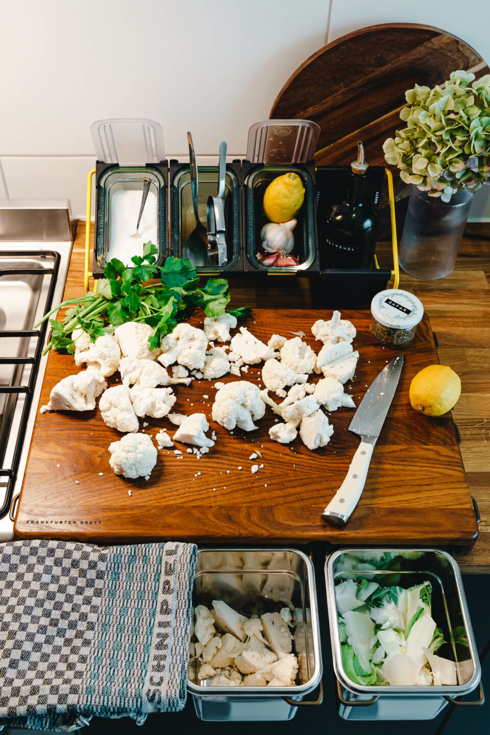 Für das Rezept nimmt man einen großen Blumenkohl, halbiert ihn und schneidet den Strunk keilförmig heraus, um den Kohl einfacher in große Röschen teilen zu können. Diese werden mit etwas Olivenöl und einer Prise Salz vermengt, dann kommen sie für vorläufig 15 Minuten zum Rösten in den heißen Ofen. Es ist ratsam, den Ofen vorzuheizen, damit der Blumenkohl Röstaromen entwickeln kann, ohne zu lange gegart werden zu müssen. Währenddessen wird der vegane Feta mit Sojajoghurt, Knoblauch, Salz und etwas Zitronensaft zum veganen „Whipped Feta“ gemixt. Nach der ersten Ofenrunde geben wir großzügig Zatar und einen weiteren Schluck Olivenöl über den Blumenkohl und lassen ihn für weitere 10–15 Minuten weiter rösten.
