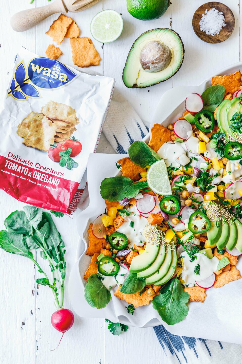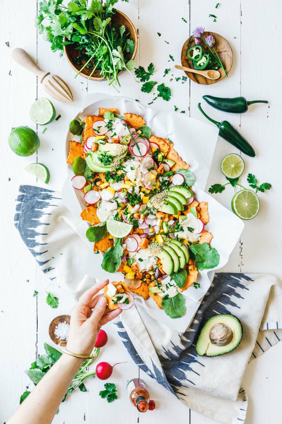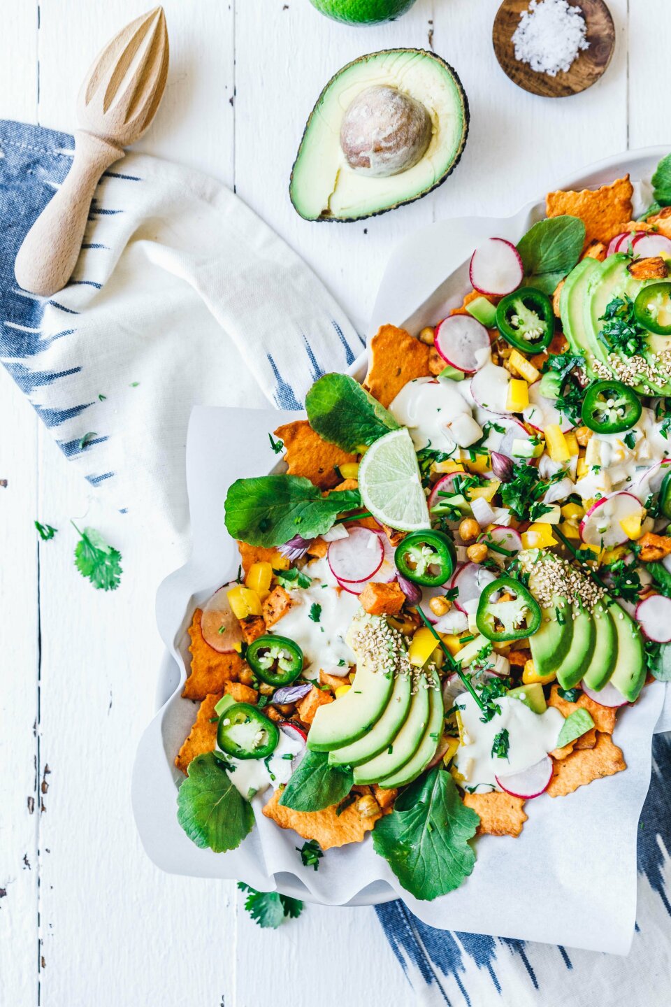 Gesunde Nachos mit Kichererbsen, Süßkartoffeln und frischen Kräutern