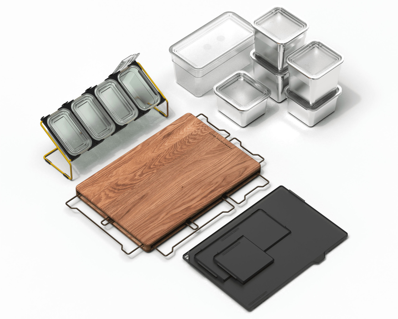 Mise-en-Place-Ultras wie wir dürfen sich auf ein Mono-Brett in Eiche mit Bronzebügeln, ein Set Edelstahl-Behälter für alles, was fertig geschnippelt wurde, eine Vier-Platz-Konsole in Gelb mit flaschengrünen Behältern, in denen Salz, Knoblauch, Kleinequipment und natürlich Chilis Platz finden und auf vielseitige „Schnittstellen“ in drei Größen freuen, die dabei helfen, dass sich das Aroma vom erwähnten Knoblauch nicht auf den Nachtisch-Apfel überträgt. Quasi auf die Vollausstattung.