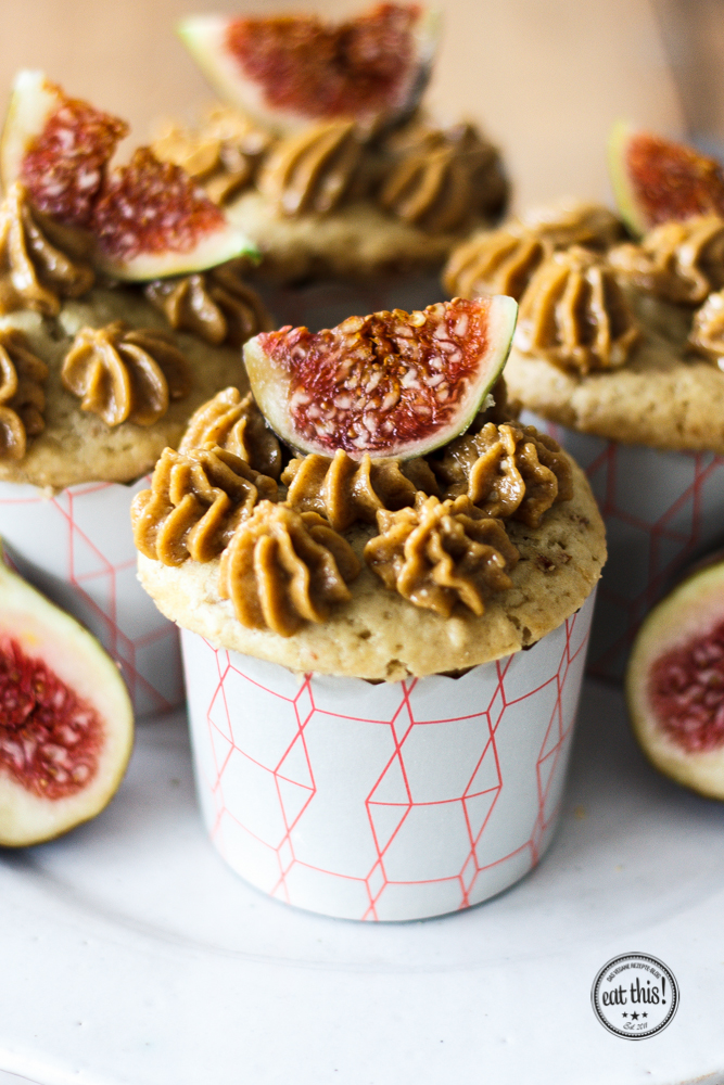 Die Cupcakes nach Belieben mit der Haselnusssahne garnieren. Die Feigen in Scheiben schneiden und je eine Scheibe auf einem Cupcake drapieren.