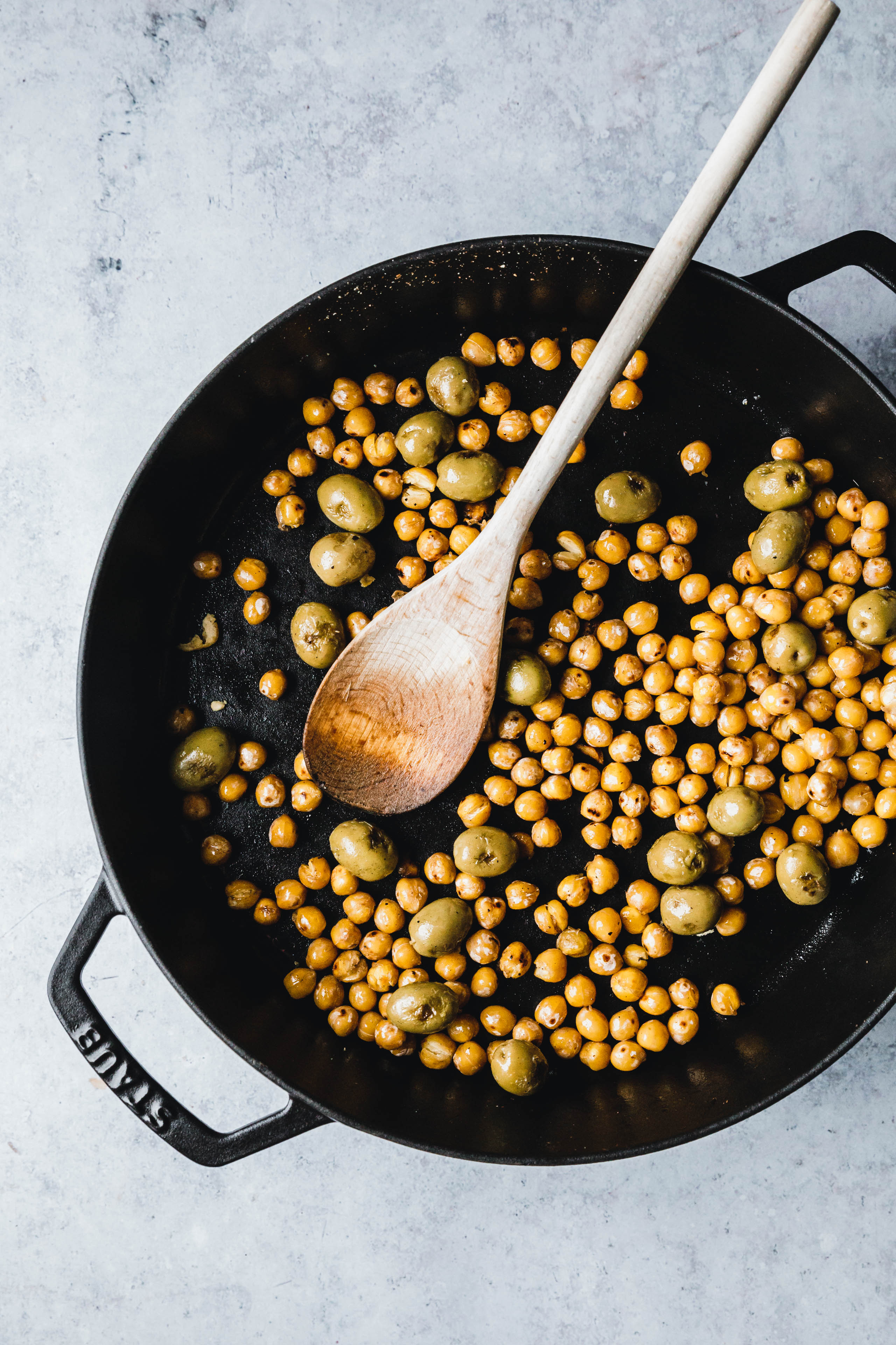 - Kichererbsen, Oliven und Olivenöl in die Pfanne geben, bei mittlerer Hitze 10 Minuten rösten. Ab und zu umrühren, Oliven anschließend leicht andrücken. Pfanne vom Herd nehmen und bis zum Servieren beiseitestellen.