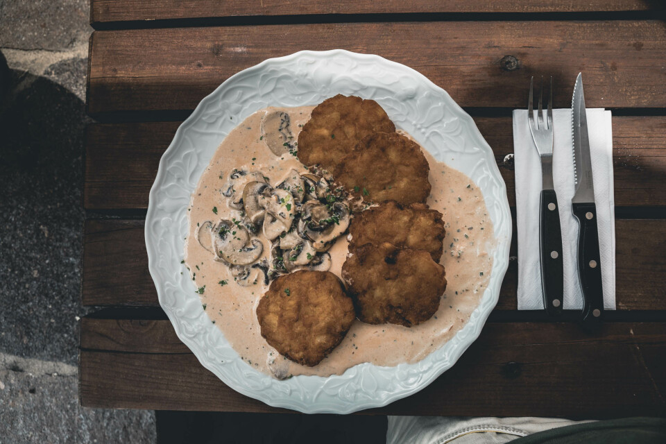 Wir haben natürlich schon vorher recherchiert, wo wir uns nach der Schlösserwanderung stärken und waren schon ganz heiß auf die Kartoffelrösti mit veganer Champignon-Rahm-Sauce beim Olivenbauern in der Kemptener Straße.