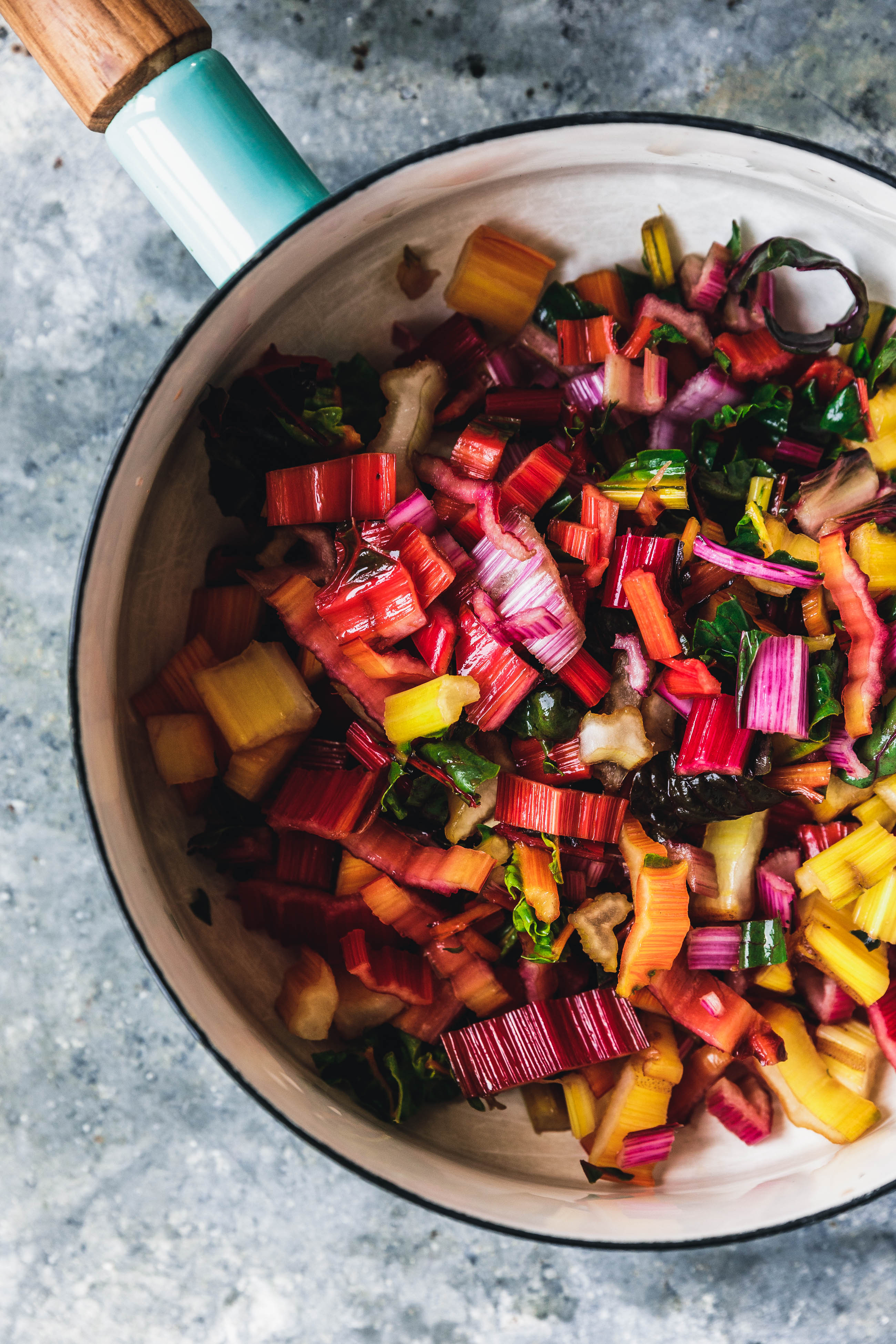 - Mangoldblätter grob hacken und zum restlichen Gemüse geben. Mit Salz und Sirup würzen und weitere 7 Minuten schmoren lassen. Ab und zu umrühren.