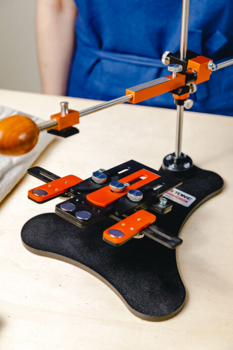 Was aussieht, wie eine Mischung aus Raketenabschussrampe und Folterinstrument (ich stelle mir etwas vor, wo Zehennägel involviert sind), ist das eines der flexibelsten Schleifsysteme überhaupt. Mit diesen Dingern kann man eigentlich fast alles machen, inklusive auch größerer Reparaturen und das Anschleifen neuer Winkel, mit Zubehör auch Scheren. Soweit ich weiß wurde das zugrunde liegende Prinzip von der amerikanischen Firma Edge Pro erfunden, mittlerweile jedoch mehrfach kopiert und dabei teils auch verbessert.