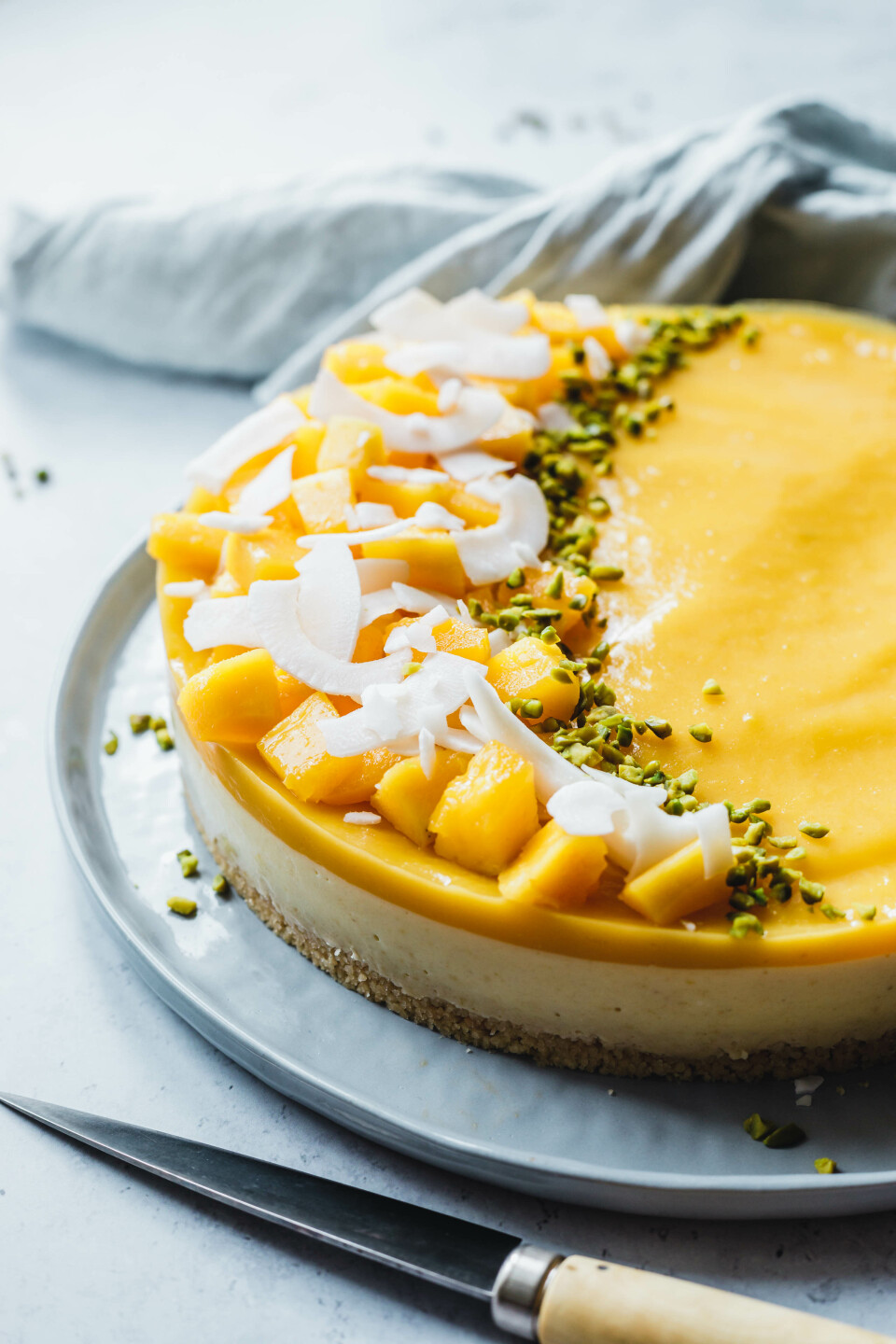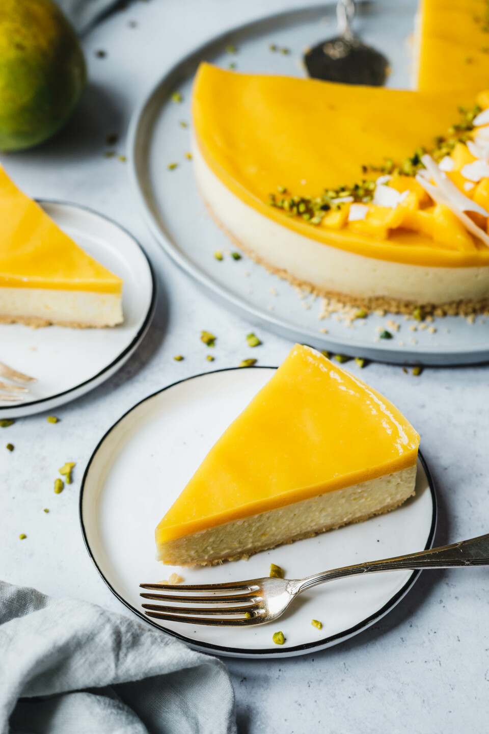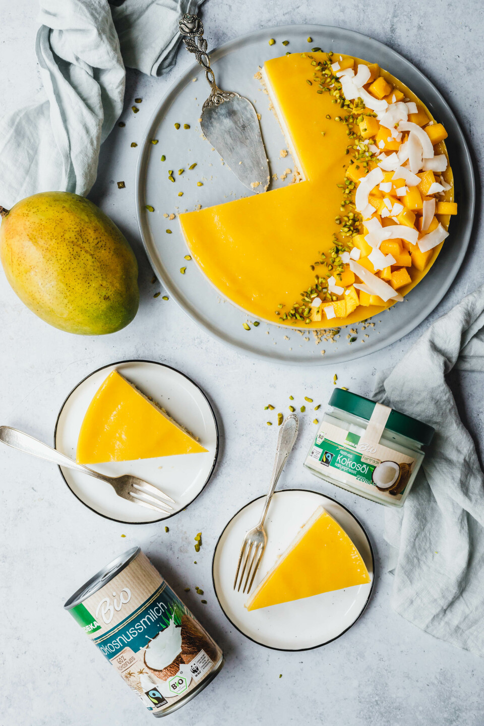 8. Hallo, habe den Kuchen gerade fertig, ich habe keinen Sojaquark bekommen und dafür Sojajoghurt genommen. Es hat auch sehr schnell angezogen, allerdings sieht die Mangoschicht nicht so glatt wie auf eurem Foto aus.