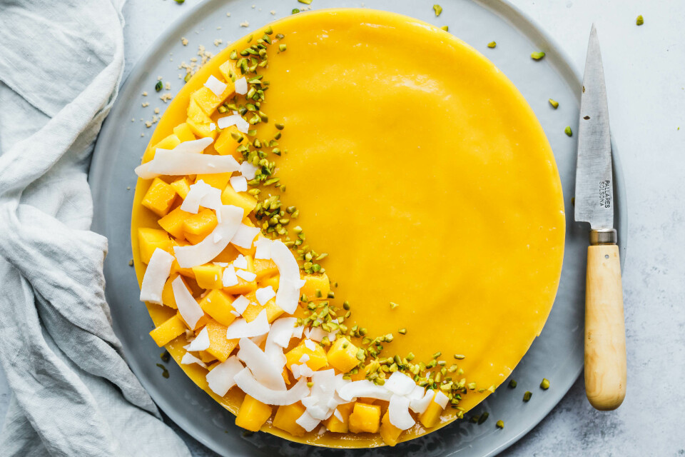 • Mango schälen und glatt pürieren. Agar-Agar mit 100 ml Kokosmilch unter Rühren 2 Minuten aufkochen, anschließend vom Herd nehmen. Die restliche Kokosmilch, Salz, 150 g Mangopüree und Sojaquark unterrühren. Masse auf dem Keksboden verteilen, glattstreichen und wieder kaltstellen.