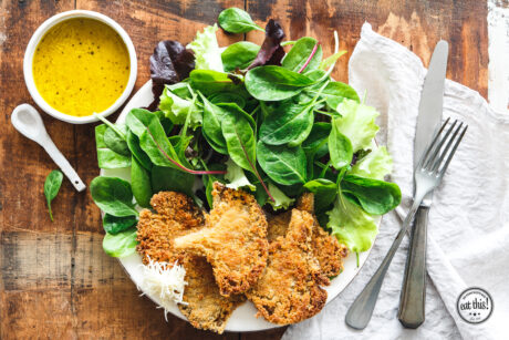 Austernpilzschnitzel mit Wildkräutersalat & Ahornsirup-Meerrettich-Vinaigrette