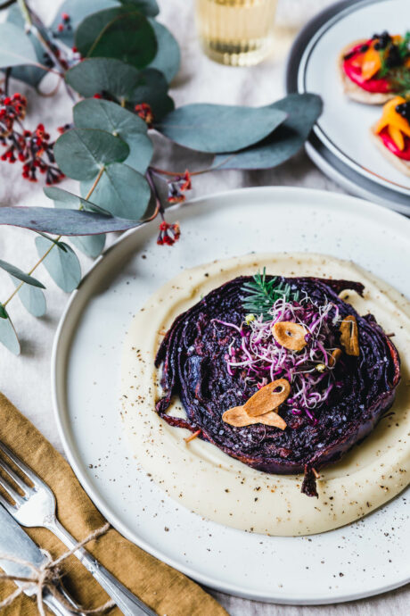 Rotkohl-Steaks mit Misobutter und Knoblauchchips