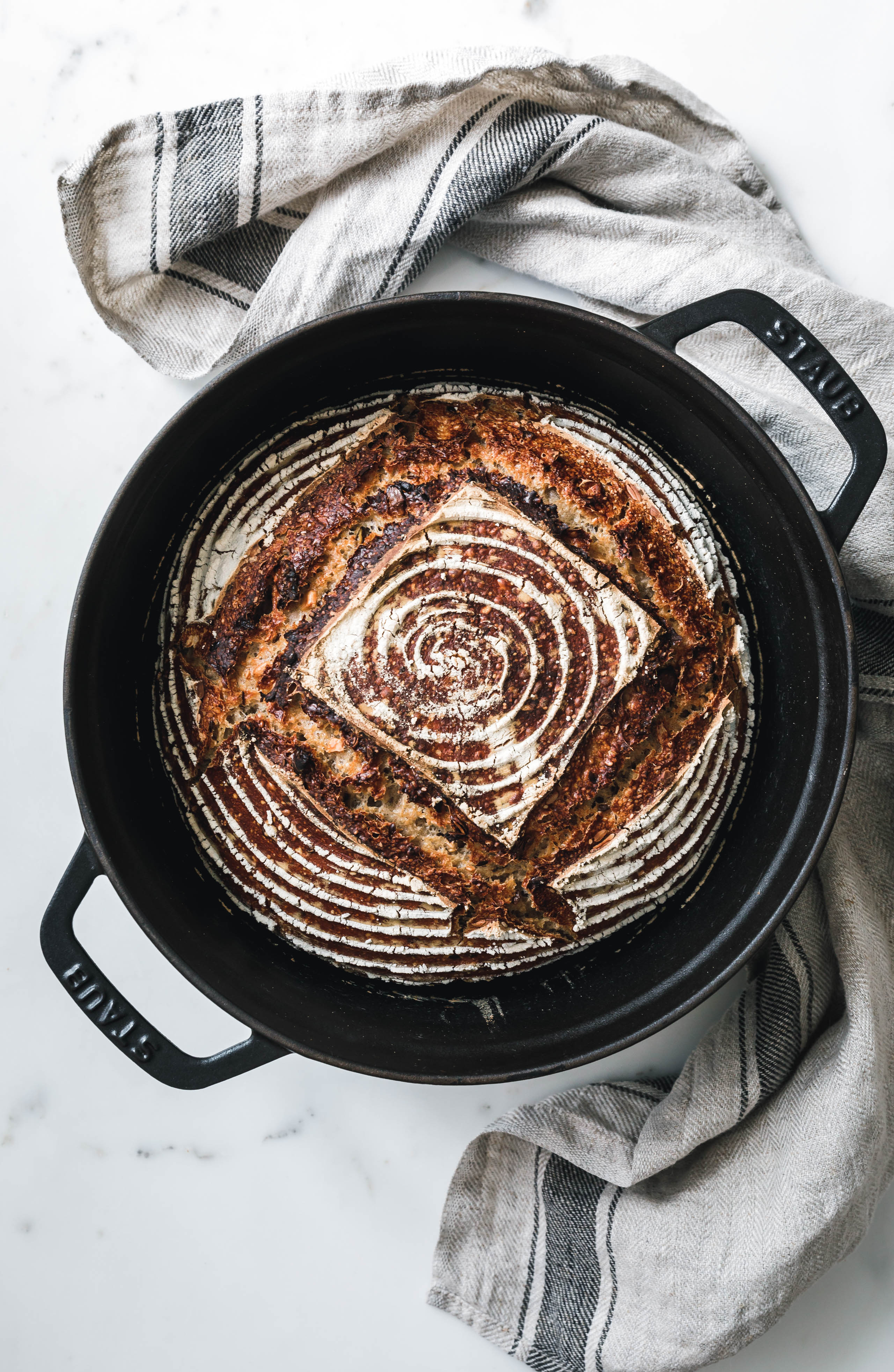 Im Gusseisentopf entsteht viel Dampf, der die Kruste knuspriger macht, das Brot jedoch saftig bleiben lässt. Den passenden Gärkorb, den wir dazu benutzen, findest du hier.