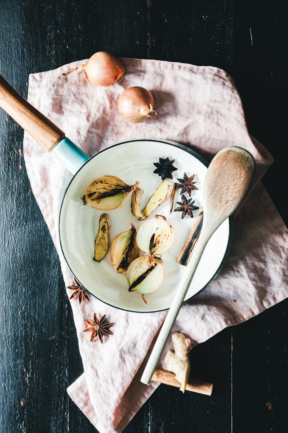 • Zwiebel ungeschält halbieren, Ingwer in grobe Scheiben schneiden. Zusammen mit Sternanis und Zimt in einem großen Topf ohne Öl bei hoher Hitze und unter häufigem Rühren 8 Minuten rösten.