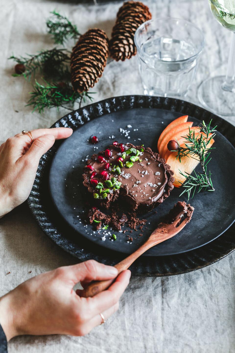 Schokoladen-Tartelettes mit Flor de Sal, Granatapfelkernen & Pistazien