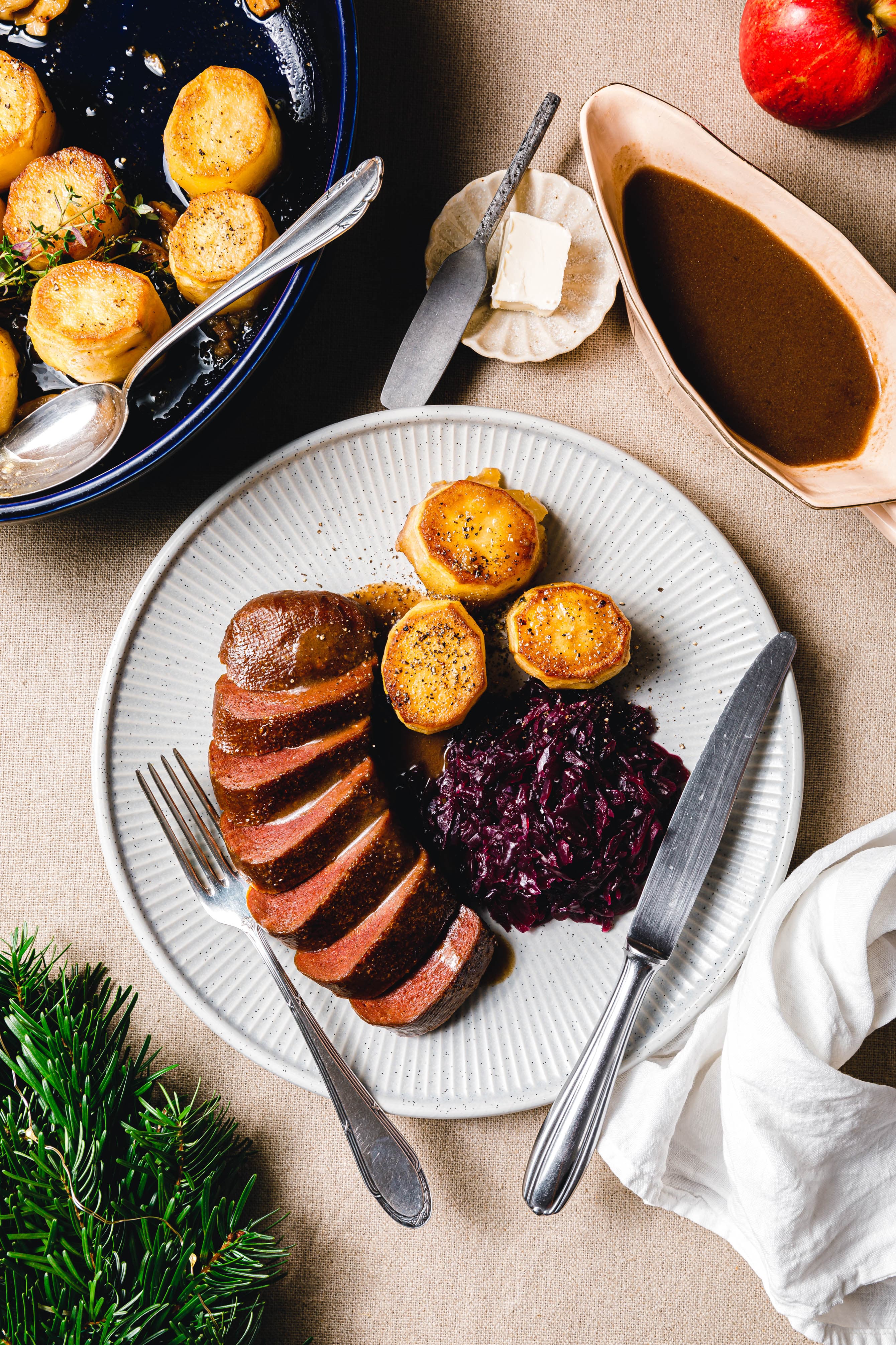 Wir Pflanzenfresser haben mittlerweile eigentlich wenig zu meckern, wenn es um klassisches Feiertagsessen geht. Also zumindest, wenn wir von der Selbstversorgung sprechen. Es gibt die vegane DIY-Weihnachtsgans im Ganzen (oder im „Gansen“? Ja, okay, ich werfe eine Münze in die Wortwitzkasse), gekaufte oder selbst gemachte Seitanbraten mit veganer Bacon-Kruste aus Reispapier, als klassischer Sauerbraten oder gefüllt mit Maronen und Champignons. Hey, die Auswahl könnte um einiges weniger appetitlich klingen.