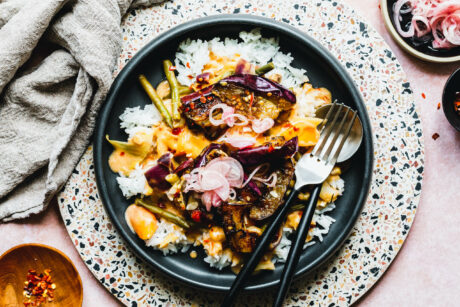 Schnelles Erdnusscurry mit gerösteten Auberginen
