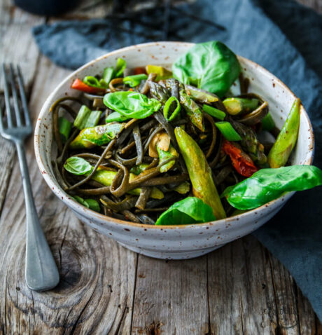 Grüner Spargel in leichter Tomatensauce auf Algen-Pasta