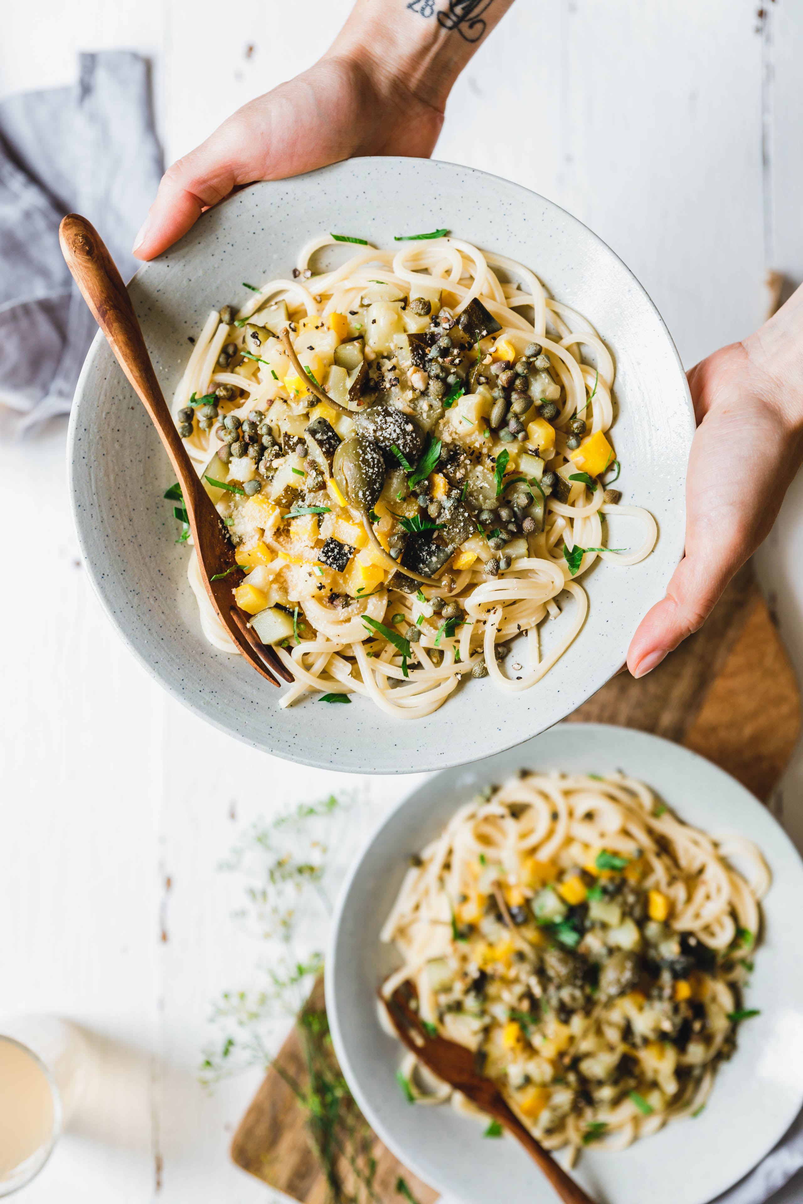 - Knoblauch fein hacken und zusammen mit Senf, Oregano und Kapern zur Sauce geben. Bei niedriger Hitze 2 Minuten ziehen lassen und auf den Spaghetti servieren. Mit Pfeffer, veganem Parmesan und Petersilie toppen.