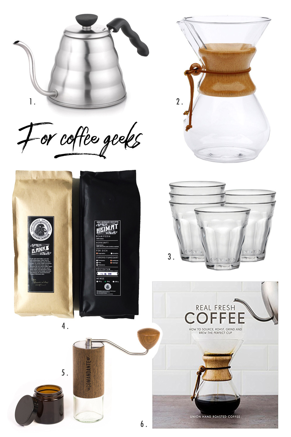 1. Hario Wasserkessel / 2. Chemex / 3. Duralex Kaffeegläser / 4. Lieblingskaffee und -espresso von Schwarzmahler / 5. Handmühle von Comandante / 6. Kaffeewissen