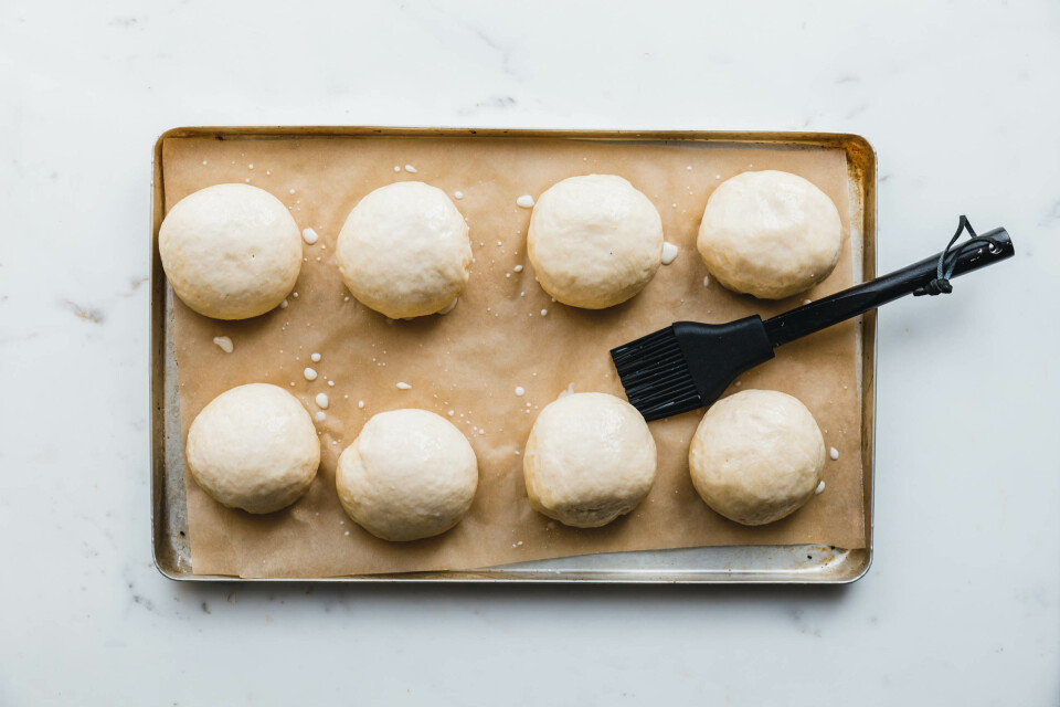 • Anschließend in 80 g schwere Teiglinge teilen und rund wirken. Auf ein mit Backpapier belegtes Backblech legen und weitere 30-40 Minuten gehen lassen.