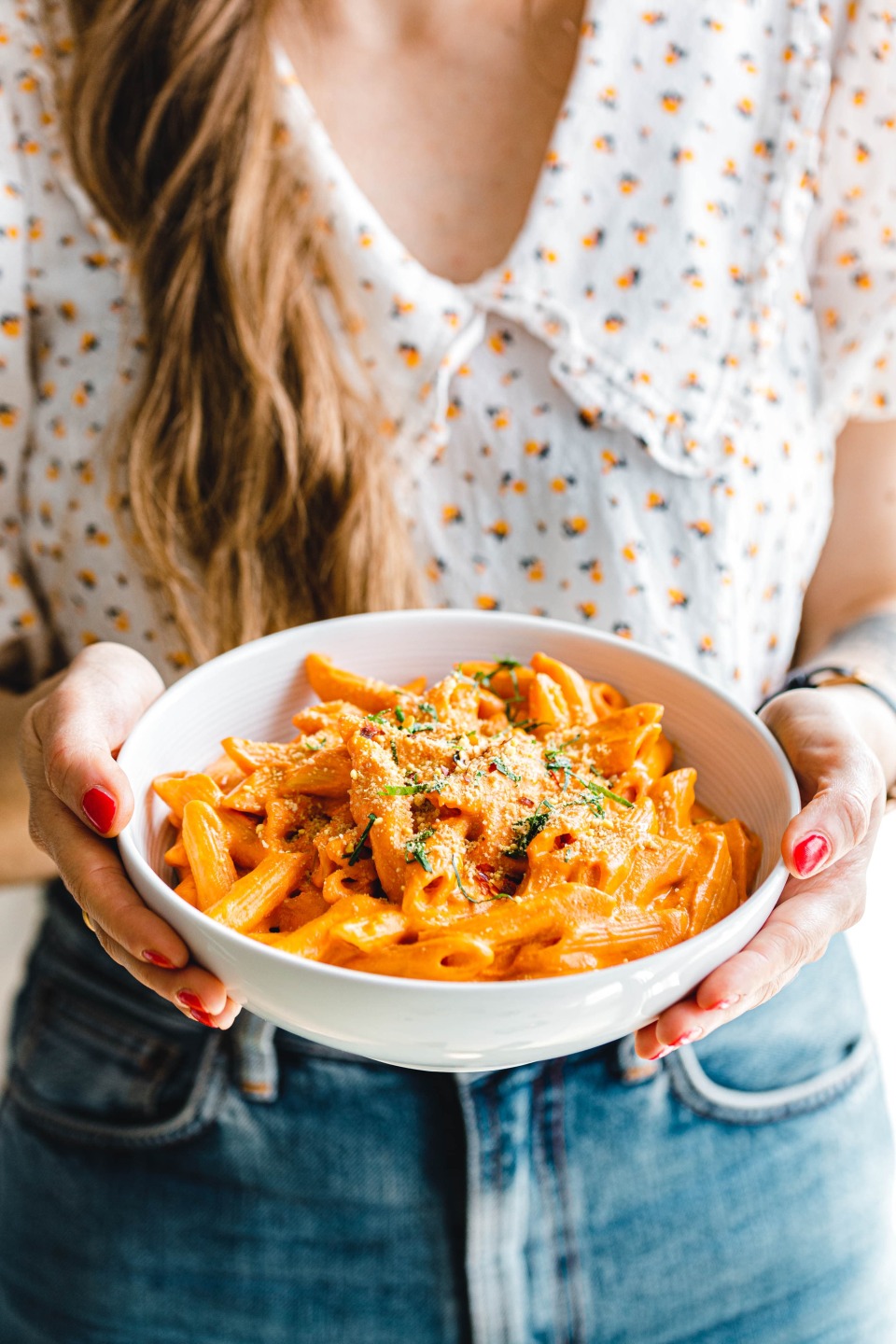 - …mit anderen Nudeln servieren? Logisch. Das Internet scheint sich ohnehin gegen die Penne verschworen zu haben, denn gefühlt wird auf jedem zweiten Rezeptfoto die „falsche“ Pastaform verwendet. Ob nun Rigatoni, Farfalle oder Mafaldine, Vodka Sauce macht beinahe alles mit, besonders gut eignen sich Nudelformen mit Rillen oder Vertiefungen, in denen sich die Sauce sammeln kann. Und mehr Sauce ist eben immer „mehr besser“, richtig?