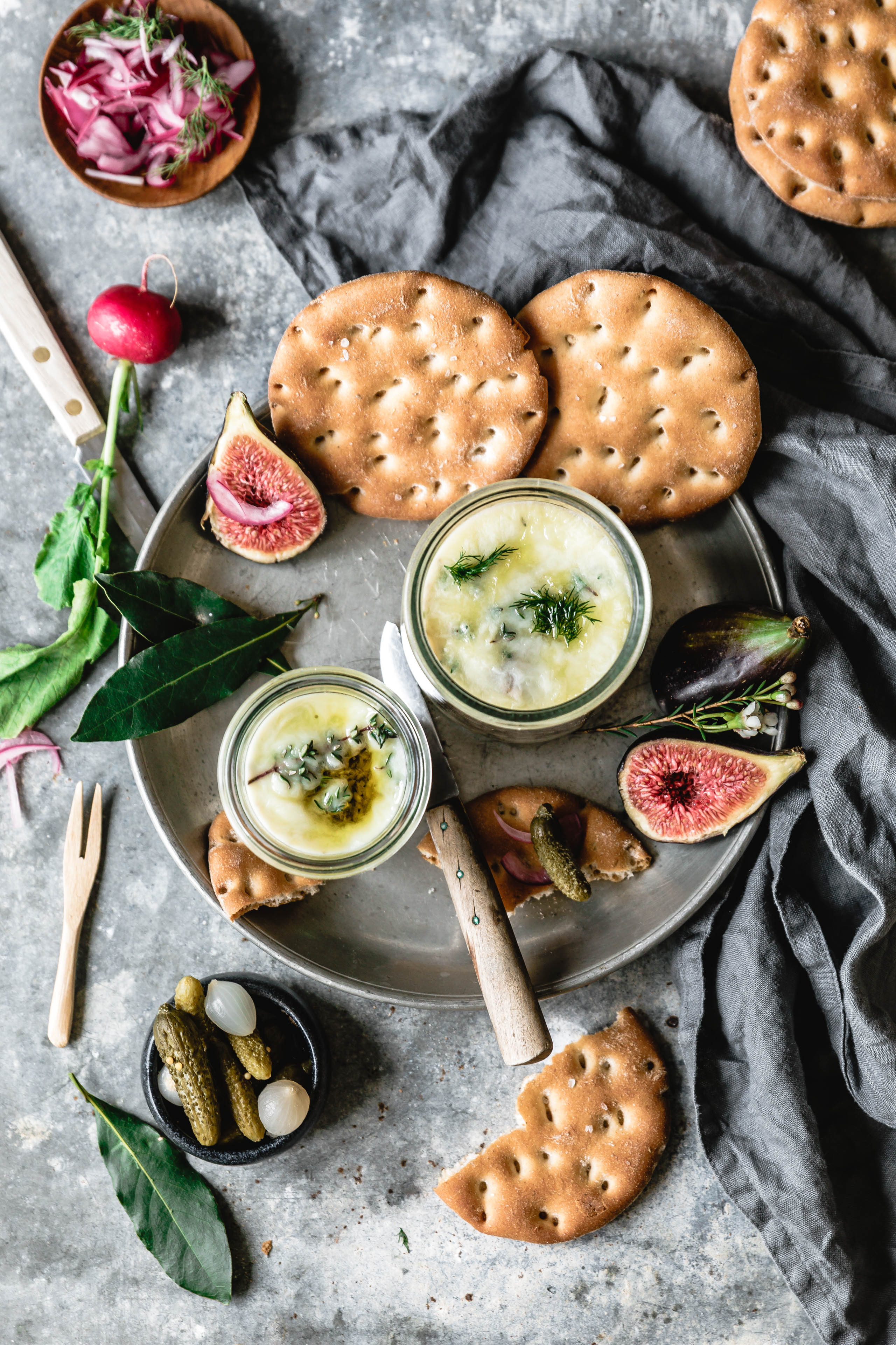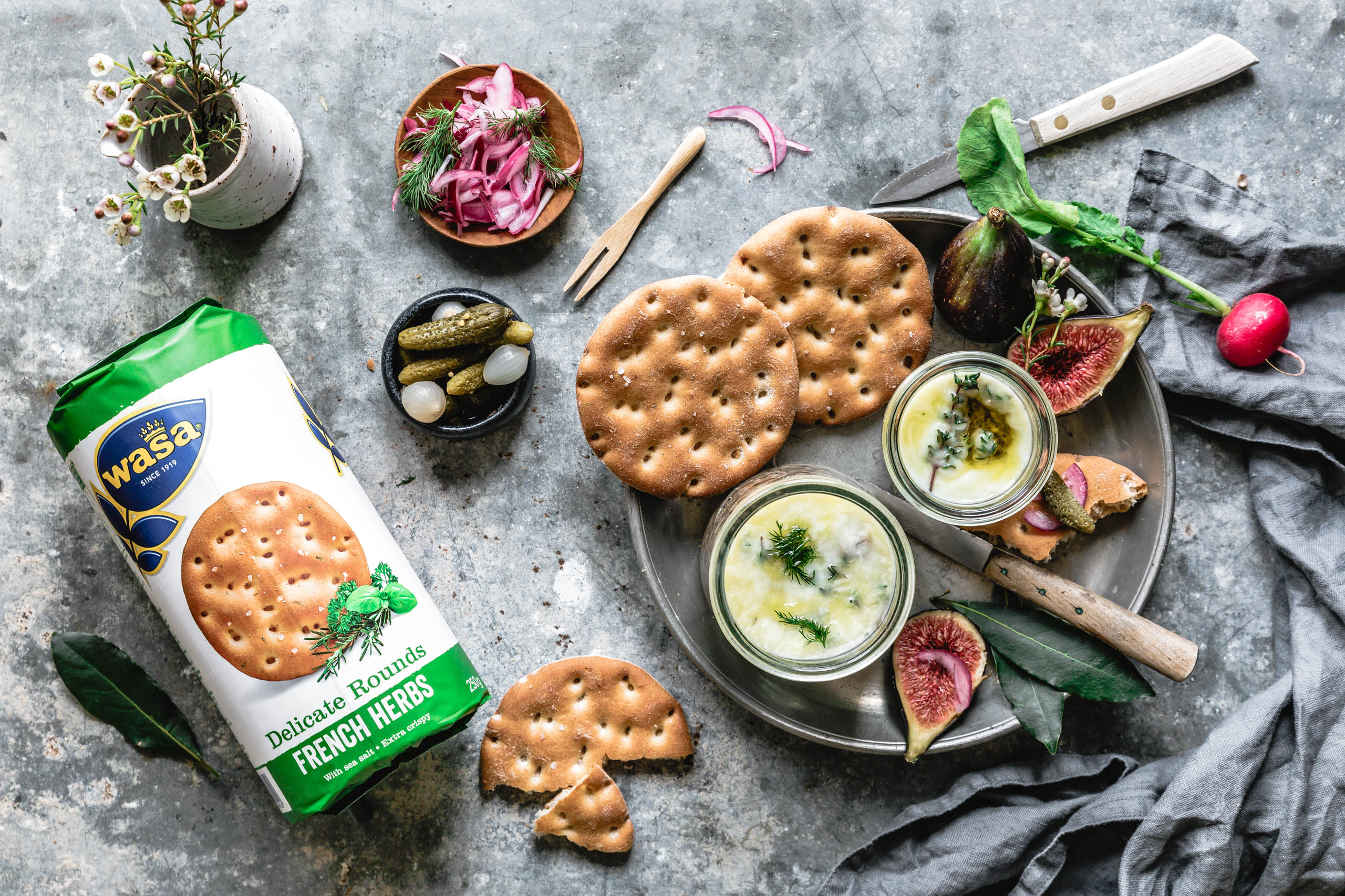 Und wo all deine Lieben schon so gemütlich und erwartungsvoll auf dem mit Kissen und Decken ausgelegten Boden sitzen – und im besten Fall schon mit einem leckeren Drink mit oder ohne Schwups versorgt sind – darfst du oberleckere Häppchen kredenzen: knusprig-luftige “Delicate Rounds French Herbs”-Cracker mit einem Hauch französischer Kräuter von WASA, getoppt mit unserer feinen Pilzterrine, eingelegten Zwiebeln, süßen Feigen, Mixed Pickles und frischem Dill.