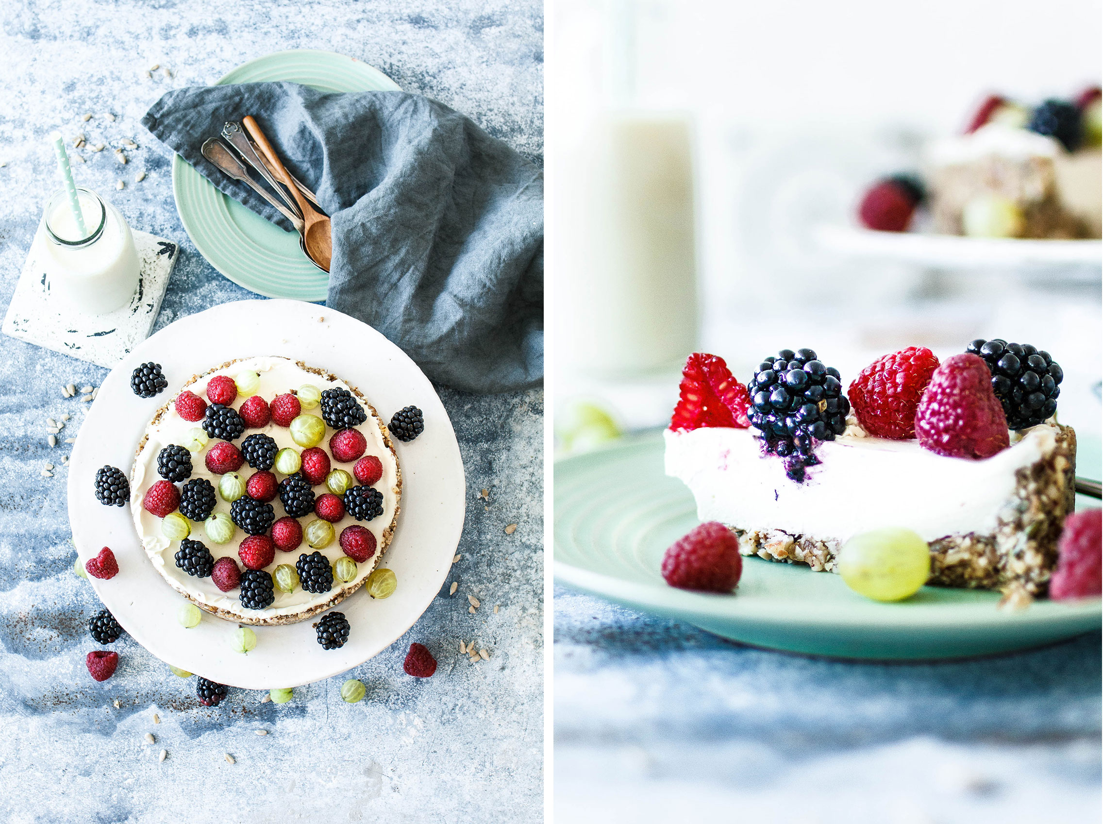 Für heiße Sommertage wollte ich jetzt einfach einen noch leichteren Kuchen, von dem man locker auch mal zwei oder drei Stückchen beim gemütlichen Kaffeeklatsch verputzen kann. Dafür habe ich einfach mehr als die Hälfte der üblichen Cashewfüllung mit frischem veganen Quark ersetzt.