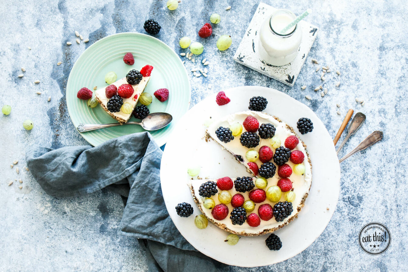 Natürlich ist der Kuchen jetzt nicht mehr 100% raw. Ist ja klar, richtig? Geschmacklich macht es aber tatsächlich keinen großen Unterschied. Genauso lecker, nur eben ein bisschen leichter. Der Kuchenboden hat auch “abgespeckt”. Zu den üblichen Mandeln kommen hier noch Sonnenblumen- und Kürbiskerne, die etwas günstiger als Mandeln sind.