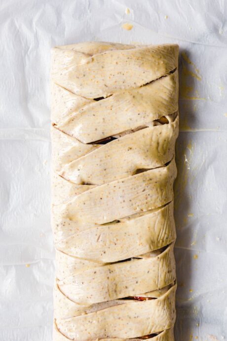 • Teig links und rechts diagonal in gleich breite Streifen schneiden. Die oberen und unteren Ecken abschneiden, die Enden am oberen und unteren Rand über die Füllung legen und etwas festdrücken. Die Teigstreifen abwechselnd von links und rechts übereinander über die Füllung legen und zu einem Zopf flechten (siehe Animation oben).