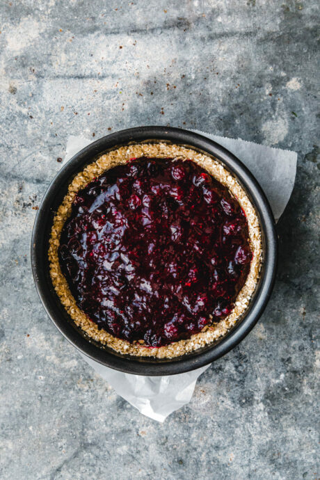 - Den Boden einer Springform mit Backpapier auslegen, die Seiten mit etwas veganer Butter oder Öl einpinseln. Den Teig gleichmäßig mit den Händen in der Springform festdrücken und einen 2cm hohen Rand bilden. Zum Schluss alles mit einem Esslöffel glattstreichen und bis zur Weiterverarbeitung in den Kühlschrank stellen.