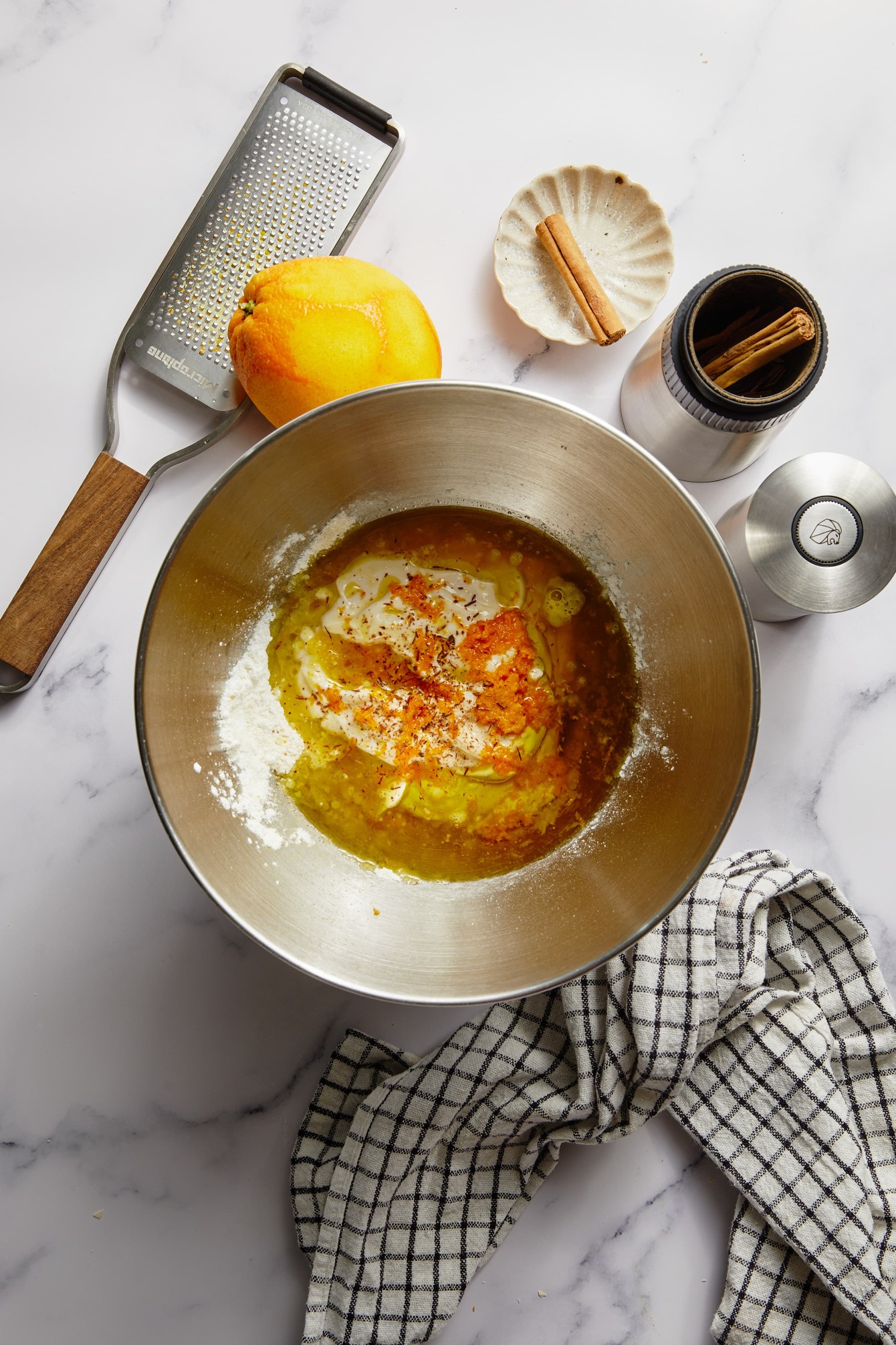 - Die übrigen Zutaten für den Teig zusammen mit den Zesten der Orange in einer Schüssel rasch mit dem Schneebesen verrühren. Filoteig mit den Händen nicht zu groß zerbröseln und unter Rühren nach und nach unter den Teig heben.235 g Sojajoghurt, 90 ml Olivenöl, 70 ml Orangensaft, 50 g Zucker, 40 g Hartweizengrieß, 8 g Backpulver, 20 g Maisstärke, 1 Prise Salz, 1/2 TL Vanilleextrakt, 1/2 Stange Zimt, 1 Orange