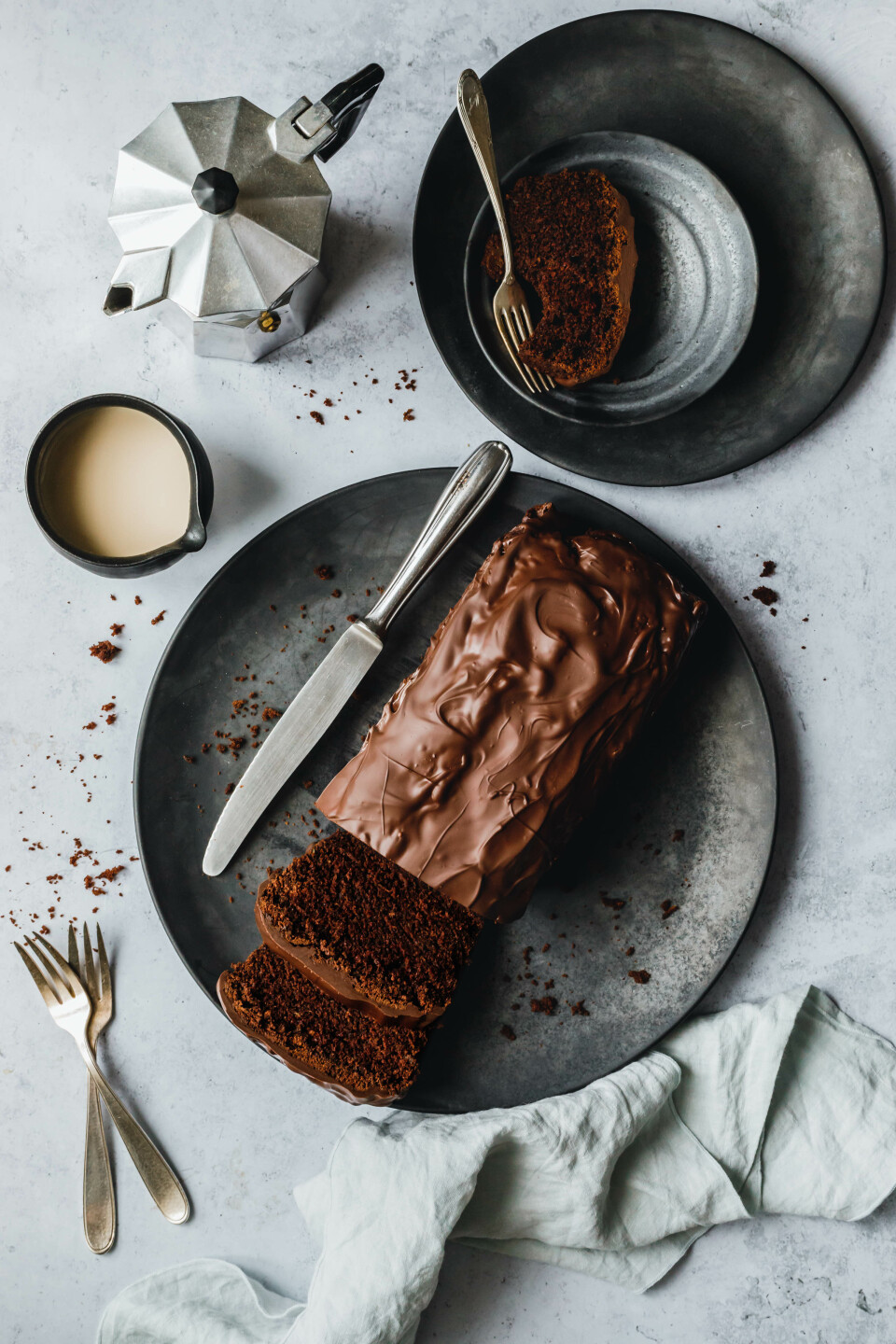 - Für die Glasur Schokolade langsam im Wasserbad schmelzen, anschließend auf dem Kuchen verstreichen und vor dem Anschneiden komplett trocknen lassen.