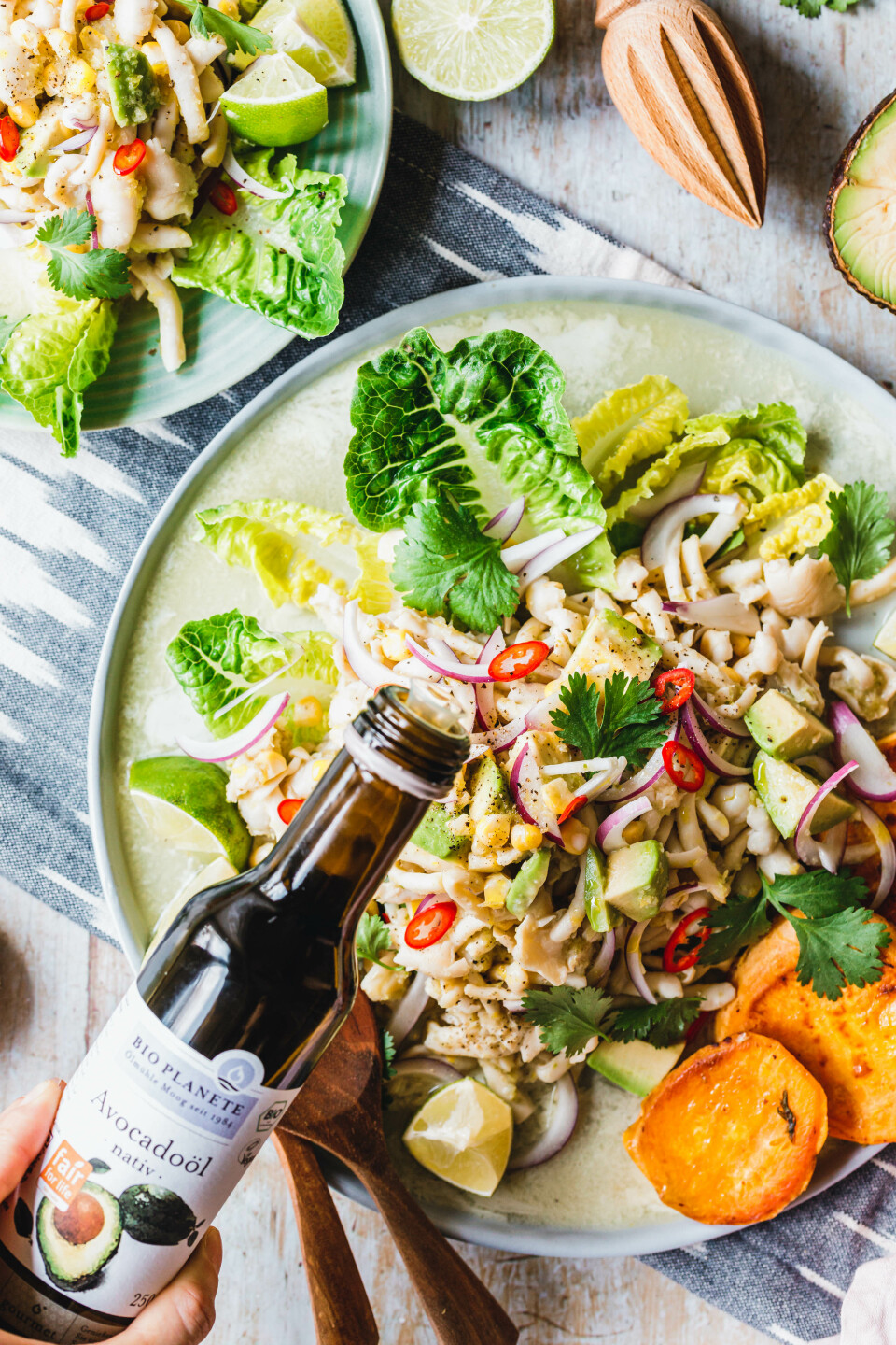 Ein paar Tropfen vom Avocadoöl als Topping – hey, mehr Avocadogeschmack ist immer besser – und fertig ist unser veganes Ceviche, diese lecker-pilzige Unverschämtheit, die in gerade mal 20 Minuten auf dem Tisch steht … und das auch nur, wenn du bei der Zubereitung trödelst. Muy rico, würde ich sagen! Muy, muy rico!