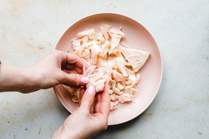 Die Jackfruit wird abgegossen und gut abgespült, da die eingelegten jungen Fruchtfleischstücke teilweise einen leicht klebrigen und recht säuerlichen Saft absondern. Anschließend wird die Frucht in grobe Stücke gezupft.