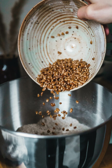 Auch das sogenannte Kochstück, also einfach gar gekochte ganze Weizenkörner, die mit in den Teig wandern, verleihen dem Brot noch mal extra Feuchtigkeit und einen tollen Biss. Das haben wir diesmal auch zum ersten Mal ausprobiert und sind begeistert.