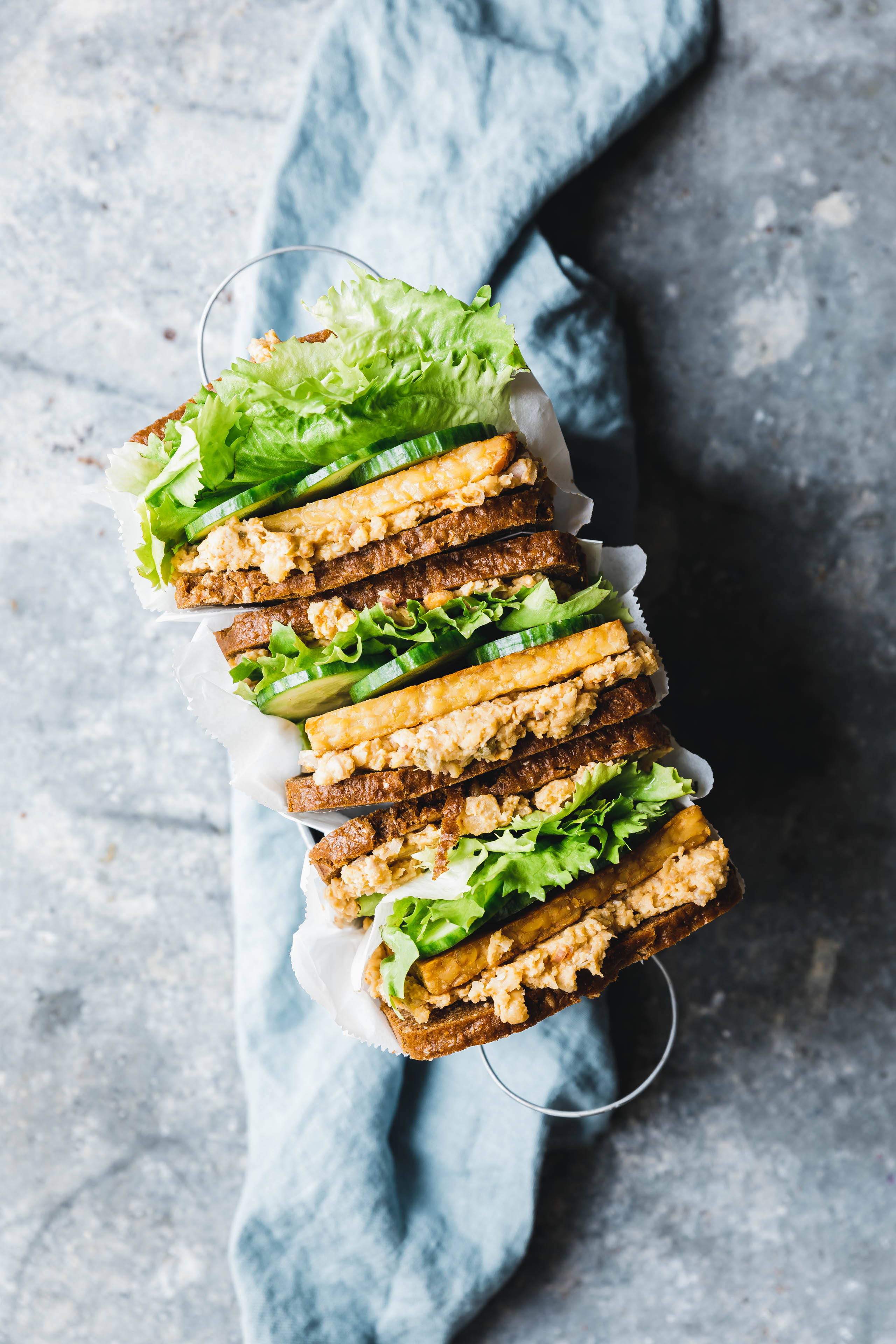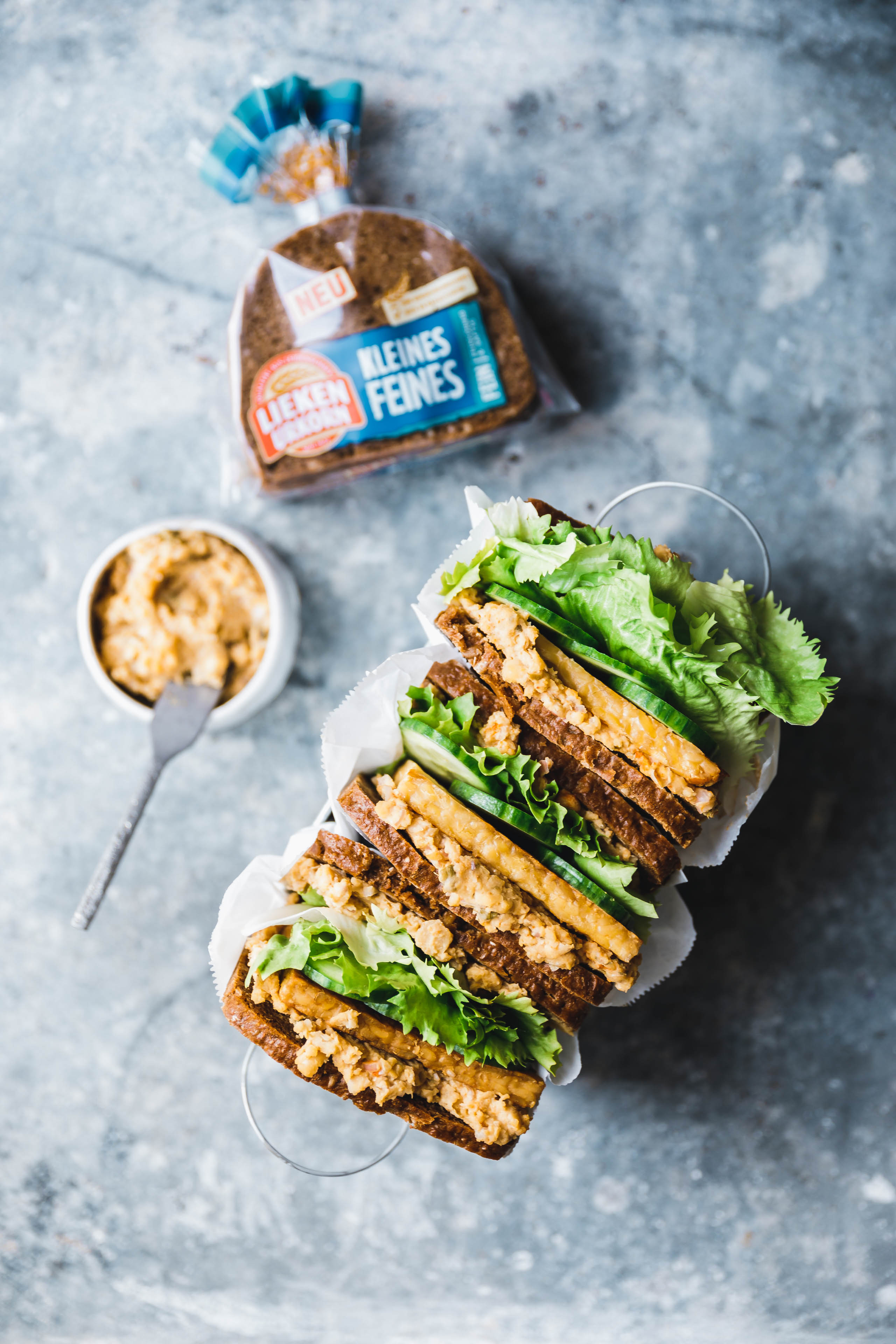- Brotscheiben jeweils mit Kichererbsensalat bestreichen. Vier Scheiben Nacheinander mit Tempeh, Salat und Gurke belegen und mit den übrigen Brotscheiben abschließen