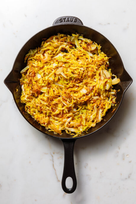 - Den restlichen Wirsing (ca. 300 g ohne Strunk) in feine Streifen schneiden. Mit in die Pfanne geben und weitere 12–15 Minuten braten, bis die Kartoffeln gar sind.
